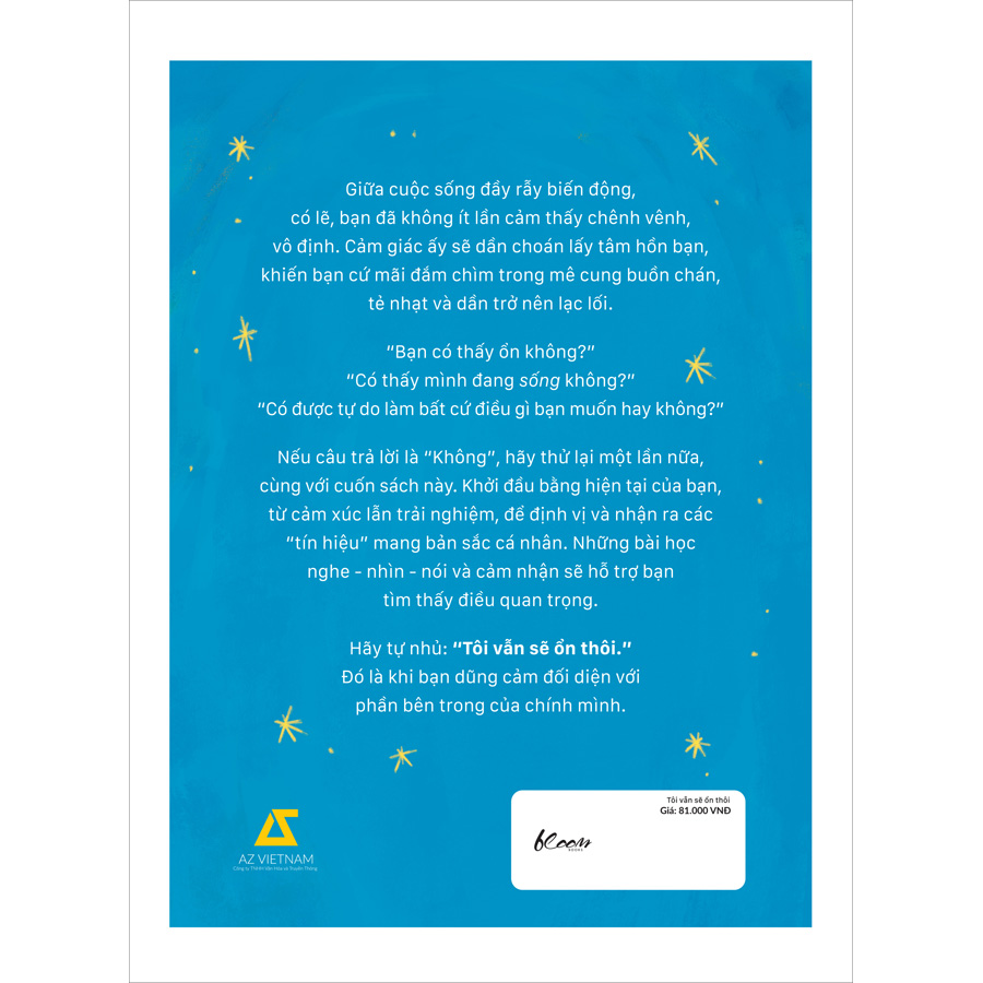 Giữa cuộc sống đầy rẫy biến động, có lẽ, bạn đã không ít lần cảm thấy chênh vênh, vô định. Cảm giác ấy sẽ dần choán lấy tâm hồn bạn, khiến bạn cứ mãi đắm chìm trong mê cung buồn chán, tẻ nhạt và dần trở nên lạc lối. “Bạn có thấy ổn không?” “Có thấy mình đang sống không?” “Có được tự do làm bất cứ điều gì bạn muốn hay không?” Nếu câu trả lời là “Không”, hãy thử lại một lần nữa, cùng với cuốn sách này. Khởi đầu bằng hiện tại của bạn, từ cảm xúc lẫn trải nghiệm, để định vị và nhận ra các “tín hiệu” mang bản sắc cá nhân. Những bài học nghe - nhìn - nói và cảm nhận sẽ hỗ trợ bạn tìm thấy điều quan trọng. Hãy tự nhủ: “Tôi vẫn sẽ ổn thôi.” Đó là khi bạn dũng cảm đối diện với phần bên trong của chính mình.