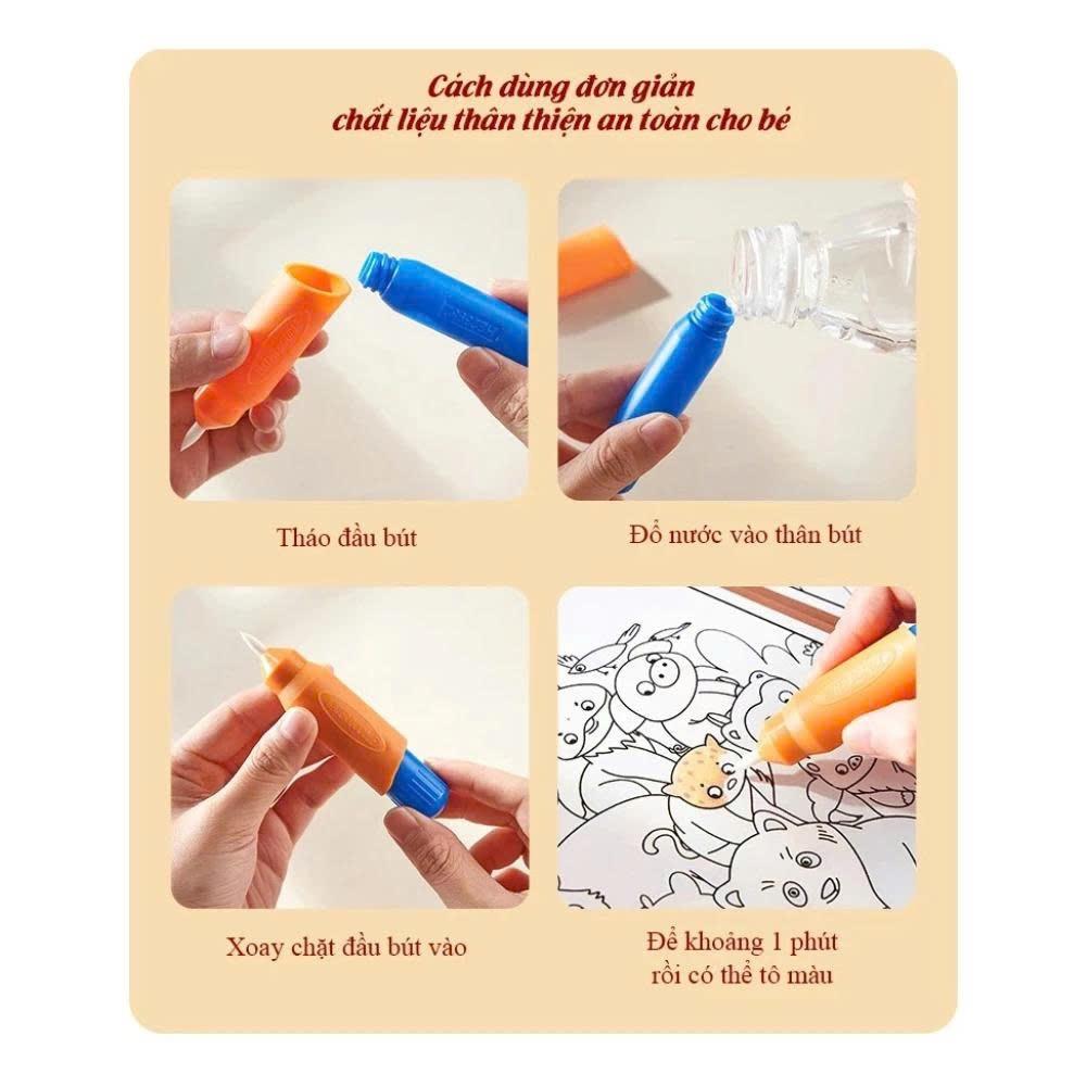 Bộ sản phẩm đi kèm 4 trang tranh vẽ nước đặc biệt, giúp bé thỏa sức sáng tạo mà không sợ bẩn. Chỉ cần đổ nước vào bút và bé có thể vẽ ngay lập tức!