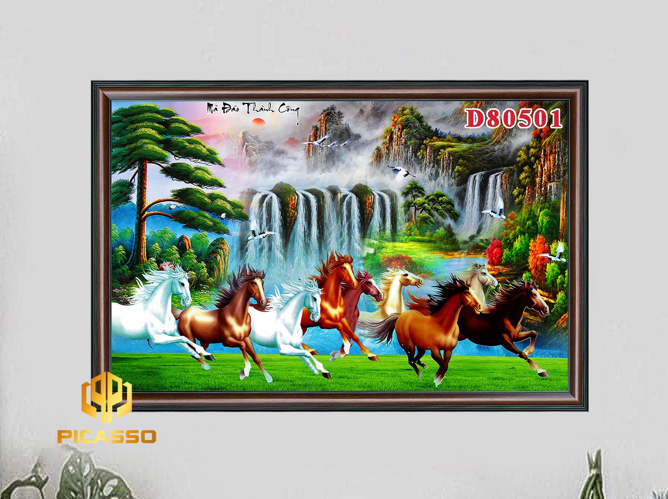 Tranh Bát Mã truy phong mạ vàng (Tranh Mã Đáo Thành Công) mang nhiều ý nghĩa phong thủy tốt lành. Là biểu tượng của Đoàn Kết - Thịnh Vượng - Thành Công. Đây được xem là