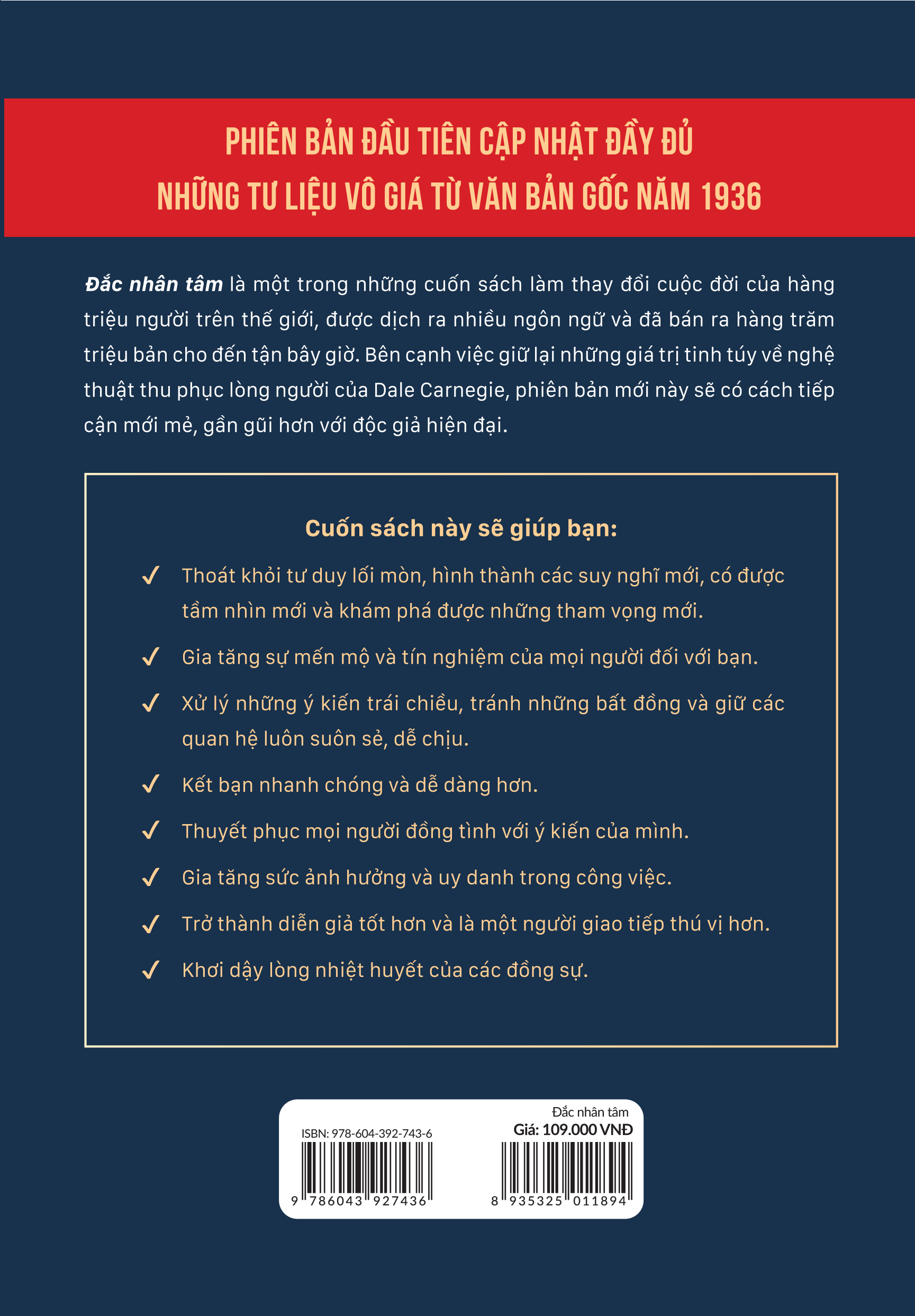 Dale Carnegie từng nói, việc kiếm được một triệu đô la vẫn dễ hơn thêm một cụm từ vào từ điển tiếng Anh. Vậy mà Đắc nhân tâm đã trở thành một cụm từ như thế: được trích dẫn, diễn giải, tái chế; được sử dụng trong vô số bối cảnh, từ phim hoạt hình, chính trị cho tới tiểu thuyết. Bản thân cuốn sách cũng được dịch sang hầu hết các ngôn ngữ được biết đến trên thế giới. Mỗi thế hệ lại khám phá tác phẩm theo một cách hoàn toàn mới và tìm ra những giá trị vẫn hữu dụng trong thời đại của họ.