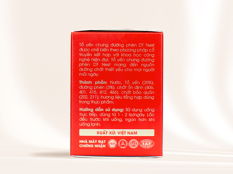 - Yến sào: Hỗ trợ tăng sức đề kháng cho cơ thể, chống lão hóa, ổn định thần kinh, trí nhớ, kích thích tiêu hóa, phục hồi sức khỏe nhanh chóng trong thời gian dưỡng bệnh. Đối tượng sử dụng: thích hợp cho mọi đối tượng đăc biệt trẻ từ 3 tuổi trở lên Sản xuất: Việt Nam Thành phần: Nước, , Yến sào (25%), đường phèn (4%) , chất ổn định (E406), hương liệu dùng cho thực phẩm. Cách dùng: - Lắc nhẹ trước khi uống, ngon hơn khi uống lạnh, tránh đun nóng sản phẩm trước khi sử dụng. - Uống trực tiếp từ lọ. --Uống từ 1 - 2 lọ/ngày. Sản phẩm thích hợp cho người lớn tăng sức đề kháng giúp cơ thể khỏe mạnh, phục hồi sức khỏe cho người bệnh, Không sử dụng sản phẩm khi hết hạn, nên sử dụng một lần sau khi mở nắp.
