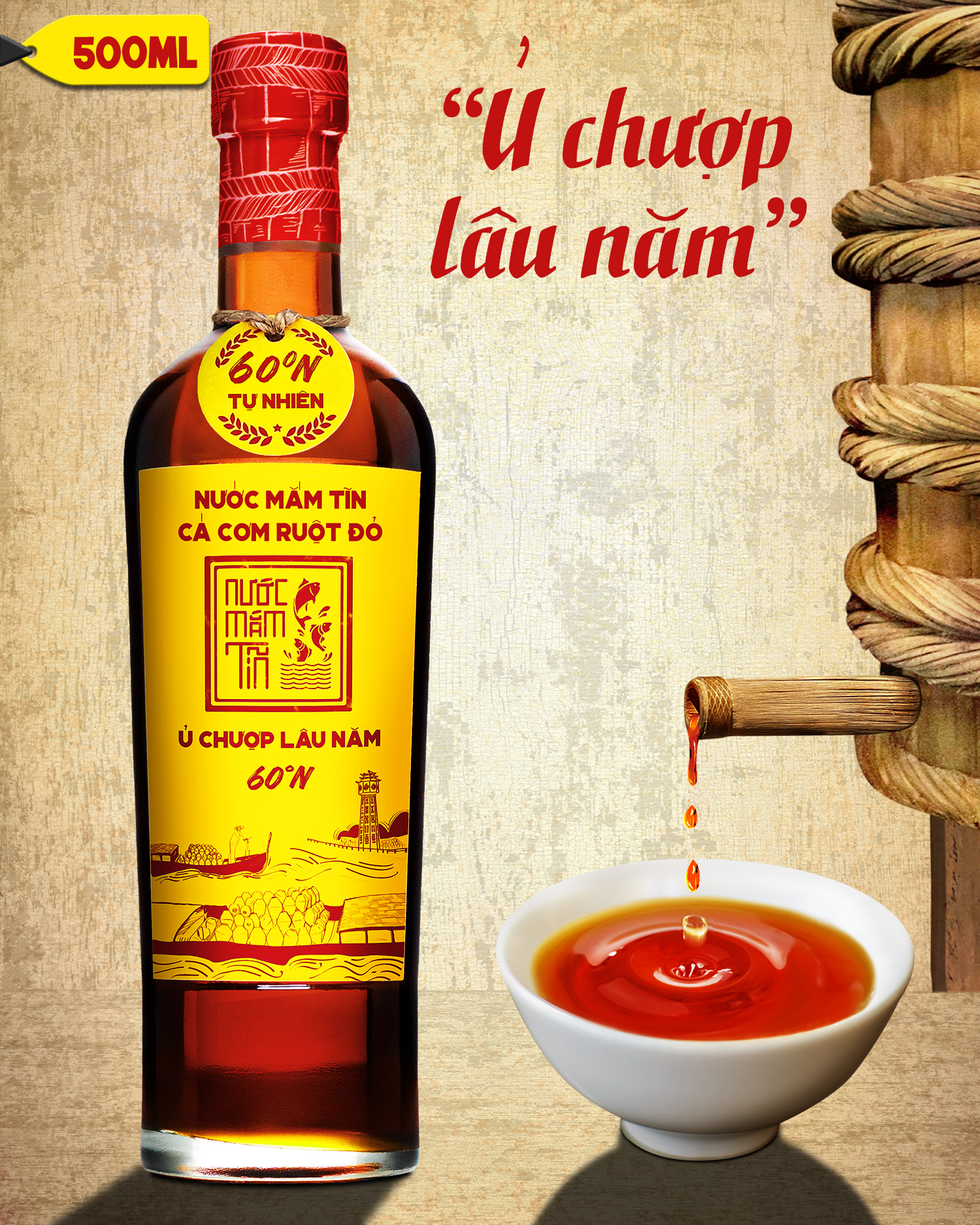 - Nước mắm cá cơm 60N độ đạm được ủ chượp bằng cá cơm vàng ruột đỏ quý hiếm gần 36 tháng theo công thức 300 năm của bảo tàng nước mắm Làng Chài Xưa
