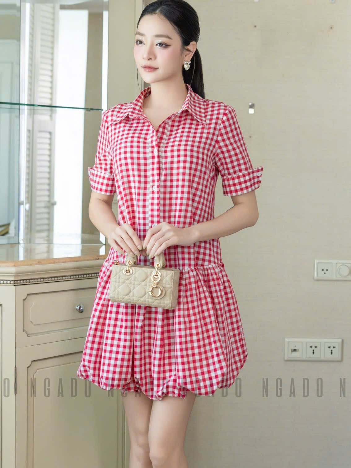 ✨Đầm babydoll caro đỏ cổ sơ mi NGADO , đầm caro , đầm Nữ