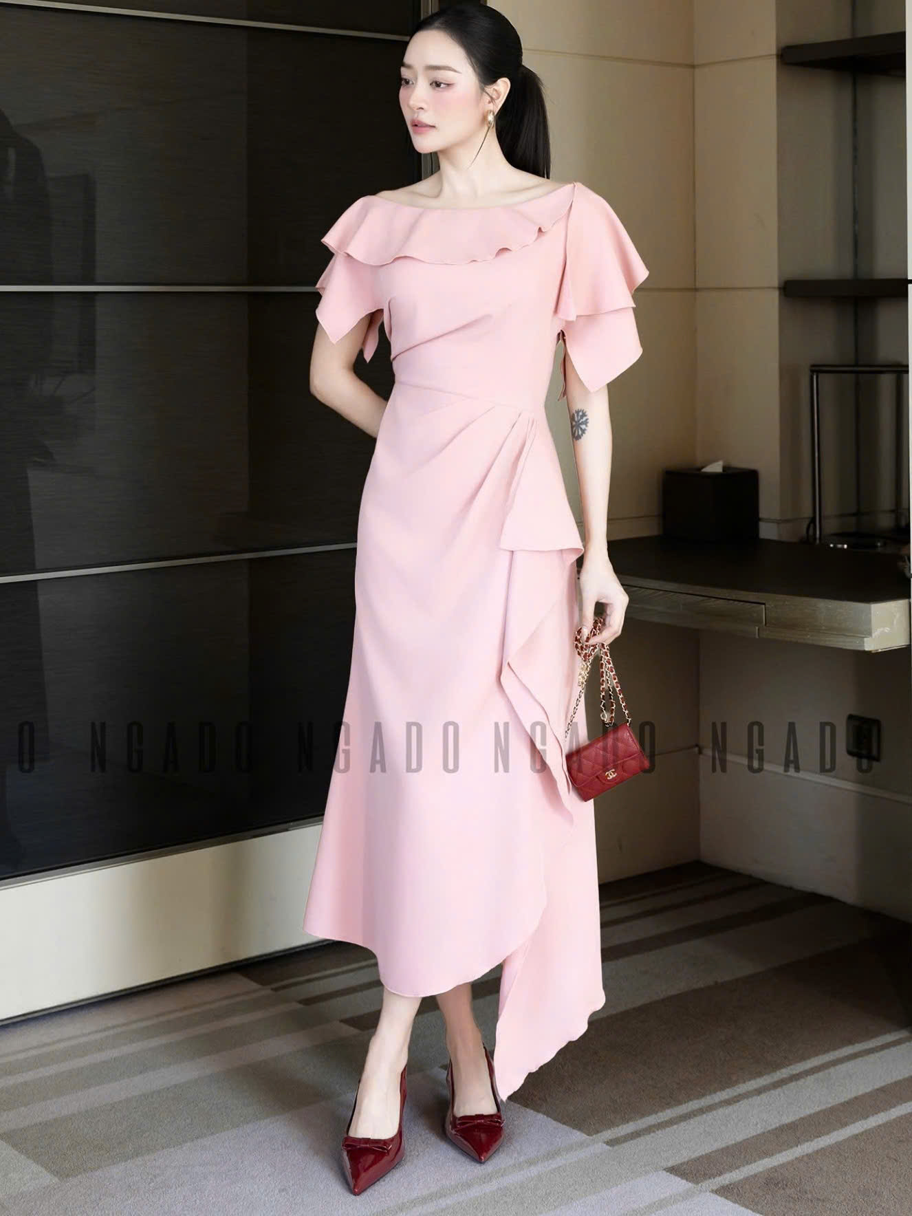 ✨Đầm hồng cổ thuyền vạt xéo NGADO , đầm dài , đầm dự tiệc , sang trọng