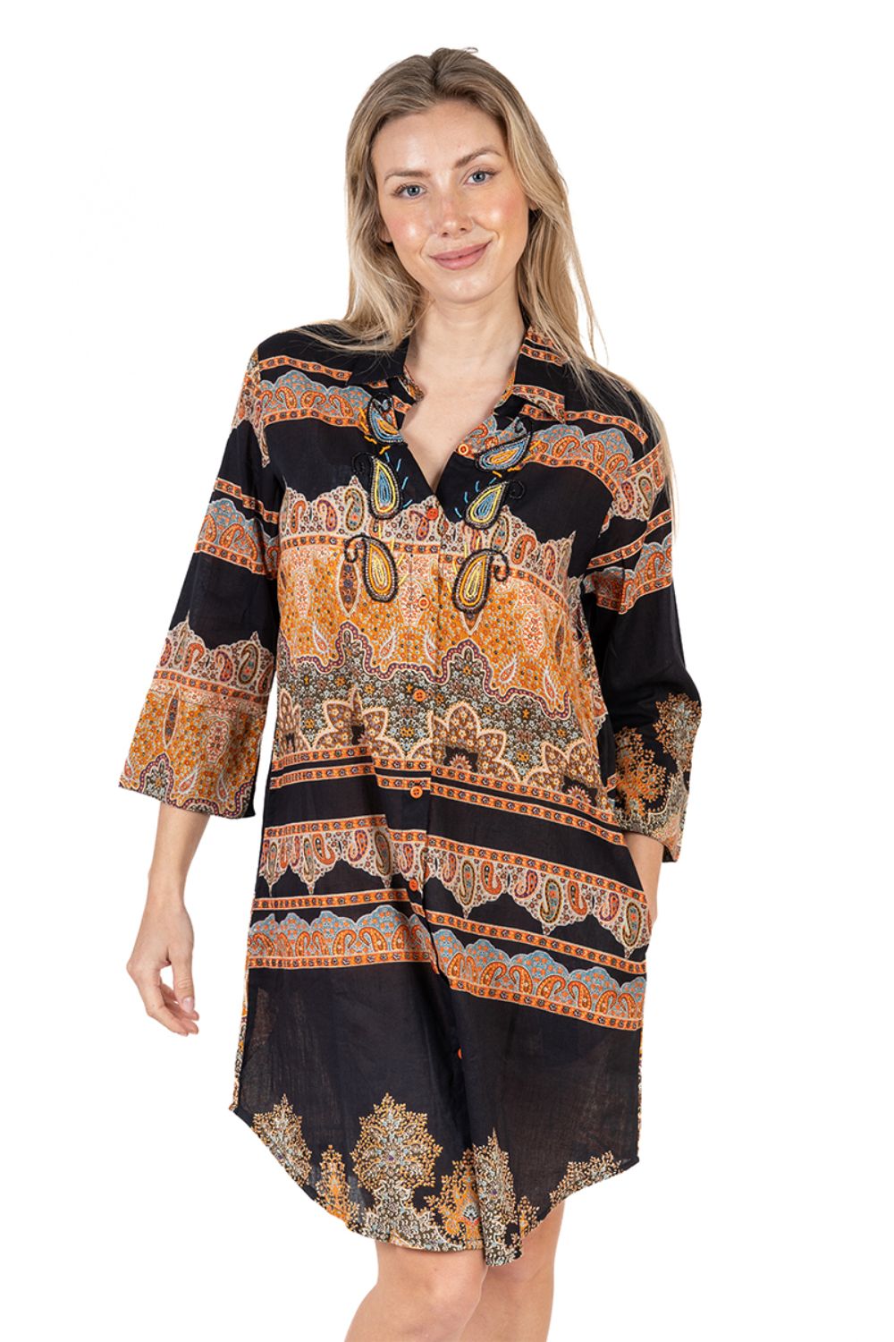Đầm Sơ Mi Cotton Isla Bonita, chất liệu cotton 100% mềm mại. Đầm giấu quần, phối với quần short, legging. Phom suông. Dài đầm 105cm (45x105) Phù hợp đi biển, dạo phố, công sở, hoặc