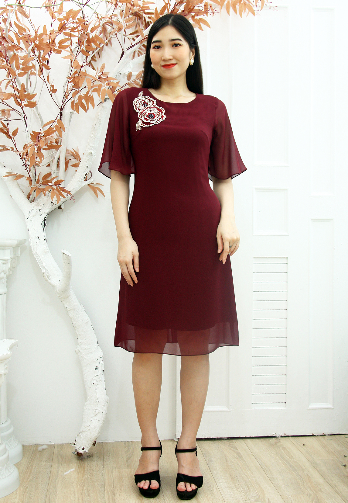 Thiết kế đầm trung niên dáng suông nhẹ nhàng thoải mái, phần tay cánh tiên giúp phái đẹp dễ dàng hoạt động, vừa che được phần bắp tay kém săn chắc. Chiếc váy được tạo điểm nhấn với chiếc hoa vải nhỏ đính đá sang trọng và tinh tế.