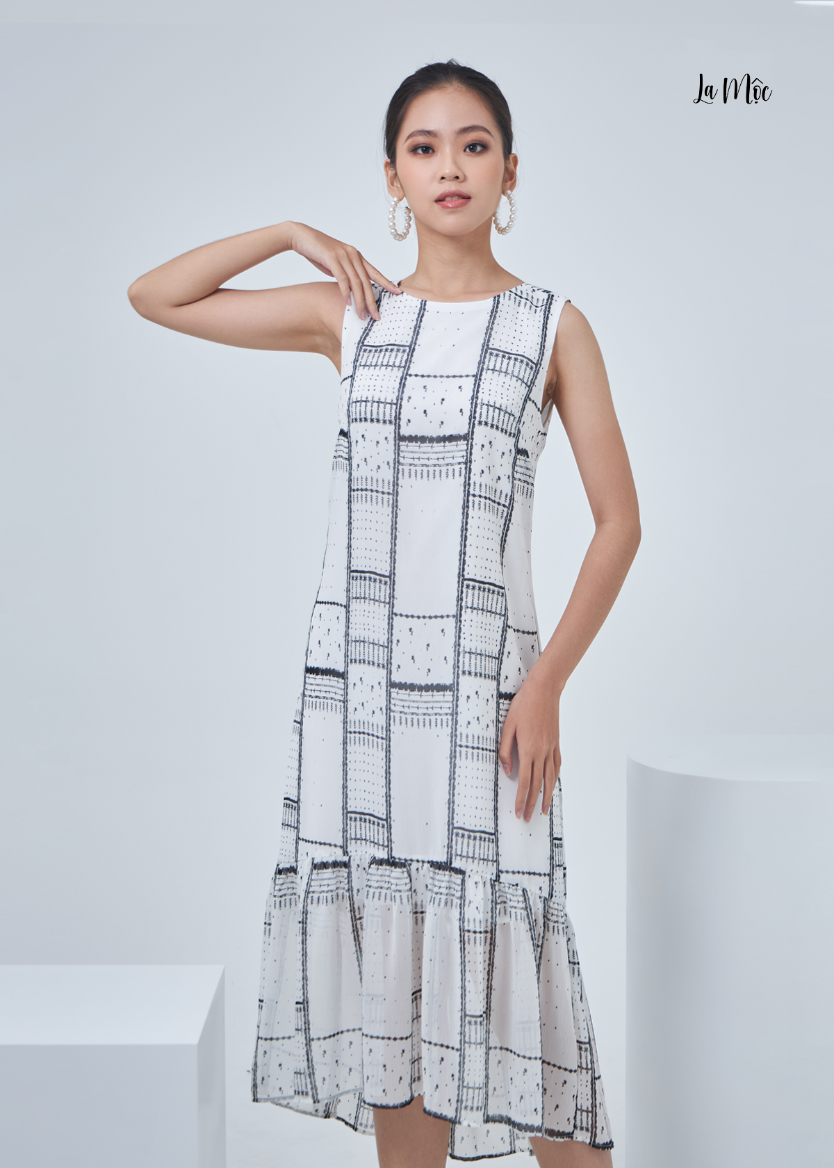 Đầm voan La Mộc dáng suông, họa tiết mini kẻ khung, tay sát nách, chân váy nhún bèo.