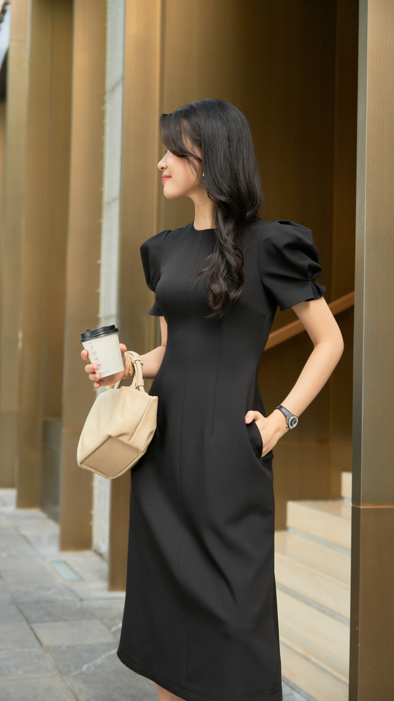 Aura Dress là một tác phẩm thời trang đầy sức hút. Với dáng dài qua bắp chân, đường cắt xòe tinh tế, cổ tròn đơn giản và hông phồng, đây là một thiết kế độc đáo và đầy nữ tính. Tay bồng ngắn và xếp ly tay trước tạo sự điệu đà và che được khuyết điểm bắp tay. Đặc biệt, phần hông được thiết kế phồng, tạo hiệu ứng vòng eo thon gọn, cân bằng tỷ lệ cơ thể, đồng thời thể hiện phong cách độc đáo thu hút ánh nhìn. Dòng hàng: Đầm Chất liệu: Đũi mịn Màu sắc: Đen/Kem