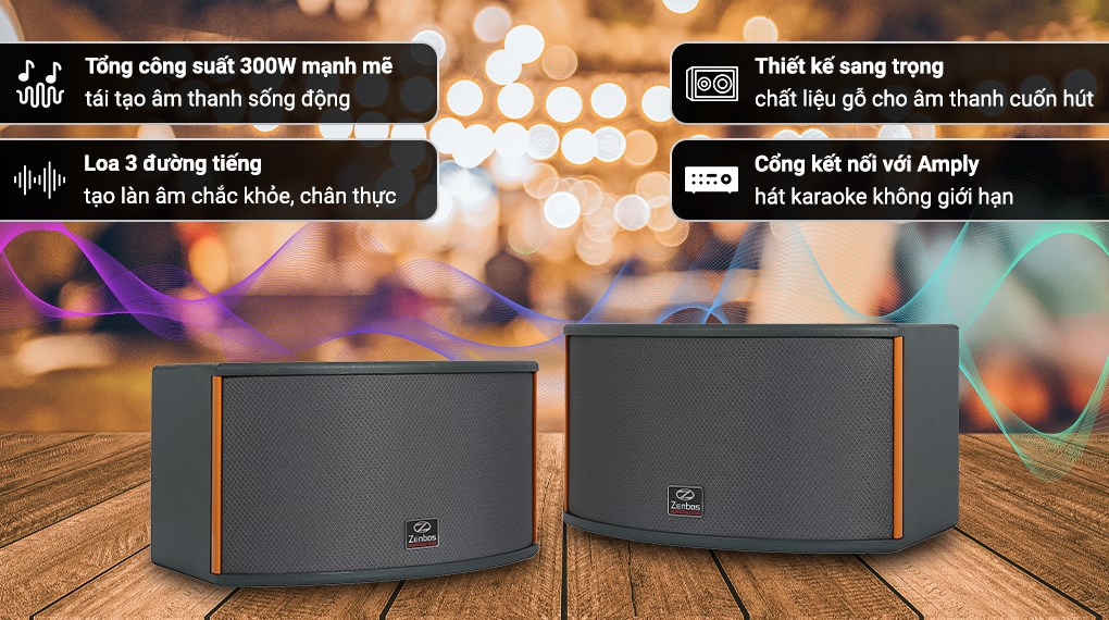 - Số đường tiếng của loa: 3 đường tiếng- Công suất: 300W/Loa- Cổng phát nhạc: kết nối với Amply- Kích thước: 48.5x28x27 cm - Nặng: 10kg- Bass: 20 cm Treble: 6 cm Mid: 10cm- Sản xuất tại: Việt Nam- Hãng: Zenbos