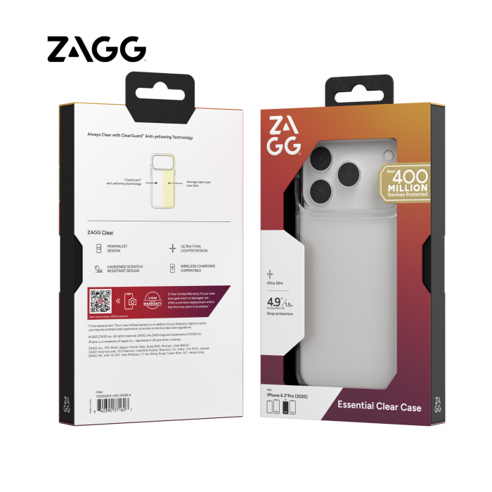 Ốp lưng ZAGG ESNTL Clear thiết kế dành cho iPhone 17 series với 4 kích thước khác nhau phù hợp cho từng dòng điện thoại: iPhone 17, iPhone 17 Air, iPhone 17 Pro và iPhone 17 Pro Max giúp ốp vừa vặn vào điện thoại của bạn, hạn chế tối đa trầy xước, hư hỏng không đáng có.