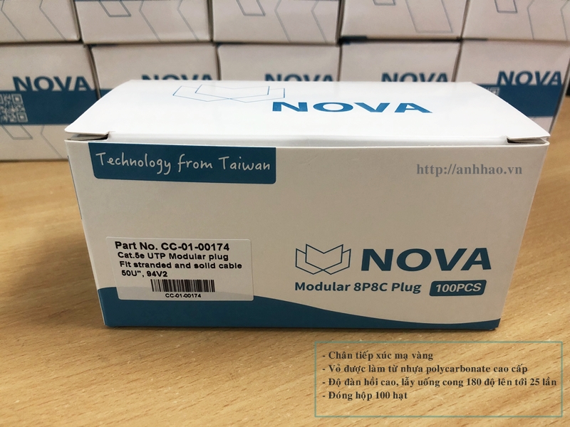 Hạt mạng cat5 Nova CC-01-00174 chân mạ vàng 50U công nghệ Taiwan Đầu bấm mạng RJ45 Cat5 Nova là dòng sản phẩm cao cấp do công ty Ánh Hào nhập khẩu và phân phối trực tiếp. Hạt