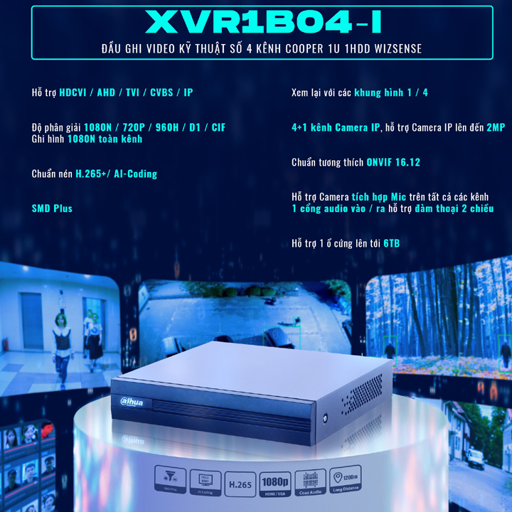 Thông số kỹ thuật: – Đầu ghi hình 4 kênh, hỗ trợ camera HDCVI/Analog/IP/TVI/AHD – Chuẩn nén hình ảnh H.265+/H.265 với hai luồng dữ liệu. – Hỗ trợ ghi hình camera độ phân giải 4K(1~7fps); 6MP(1~10fps);