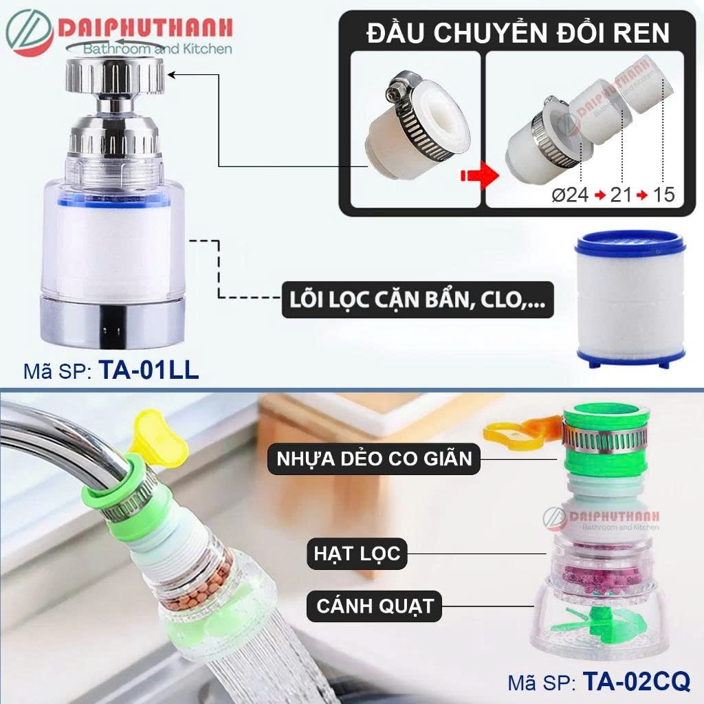 Đầu Nối Tăng Áp Gắn Vòi Rửa Chén, gồm 2 mẫu sau: Mẫu 1: Mã TA-01LL: Mẫu đầu vòi tăng áp, có lõi lọc cặn bẩn, clo,.cổ vòi có thể xoay, TẶNG kèm 1 bộ