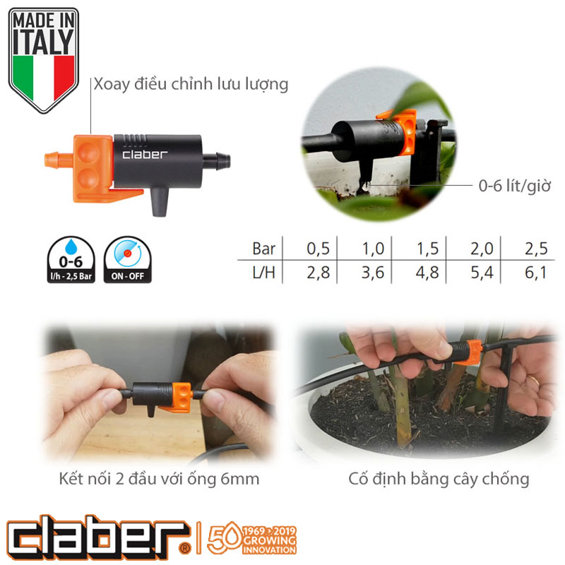 Trong một hệ thống tưới nhỏ giọt tự động, thành phần quan trọng là đầu tưới nhỏ giọt hay còn gọi là béc tưới nhỏ giọt. Để hệ thống có thể phục vụ tốt cho người dùng, Claber đã nghiên cứu ra đầu tưới nhỏ giọt liền trục với khả năng điều chỉnh lưu lượng nước hàng đầu.
