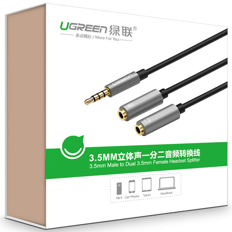 Dây chuyển đổi 3.5mm đực sang hai đầu 3.5mm cái (hỗ trợ MIC và TAI NGHE) vỏ nhôm hai đầu tách đôi dài 20CM UGREEN 30619 (xám đen) Là giải pháp hoàn hảo đáp ứng được các giải trí hoặc công việc như: Chát Yahoo, Skype hoặc Ghi âm...bằng tai nghe và MIC Hiện nay trên một số dòng Laptop, Ultrabook...đời cao cấp chỉ có 1 cổng Audio 3.5mm duy nhất (đã tích hợp 2 chuẩn Audio + MIC) Thường được dùng cho điện thoại di động, máy nghe nhạc MP3, máy tính bảng, máy tính xách tay, máy tính chia ra tai nghe hoặc hệ thống âm thanh, dàn âm li trong gia đình. Thông số kỹ thuật