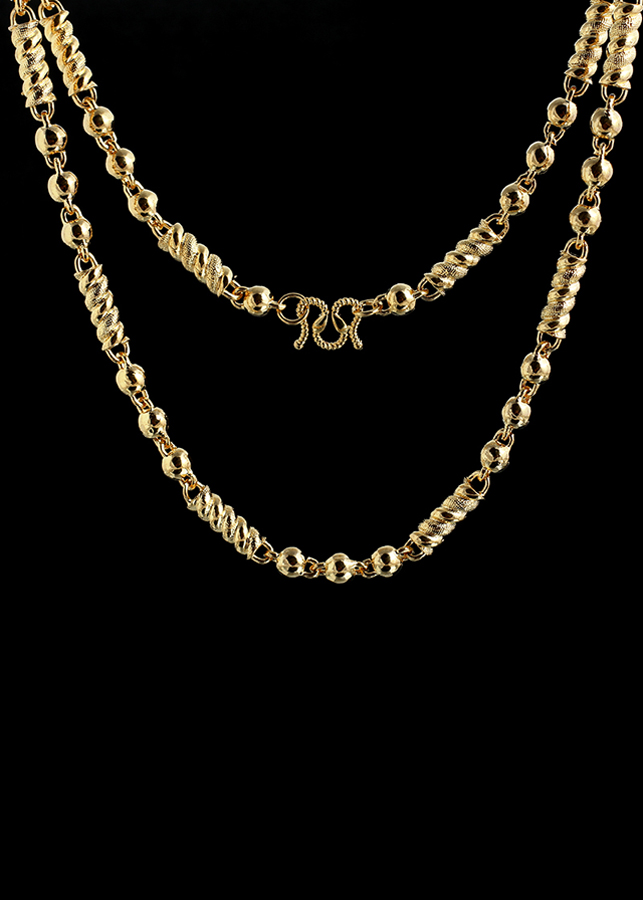 Với thiết kế sang trọng, những mắt xích với đường vân tỉ mỉ, dây chuyền mạ vàng 24k tạo sự mạnh mẽ nhưng không quá cứng nhắc.