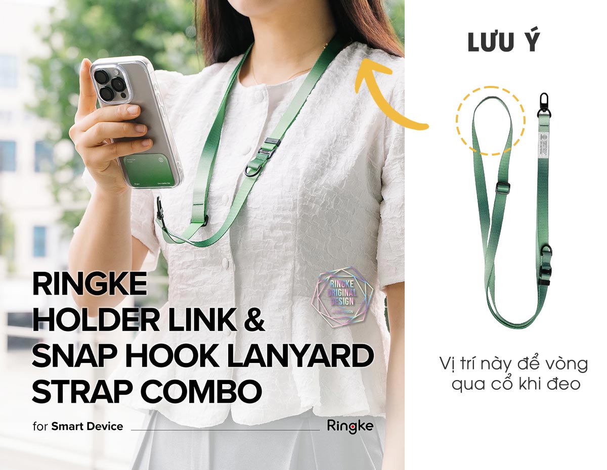 - Dây đeo Ringke Holder Link & Snap Hook Lanyard Strap là sự kết hợp độc đáo giữa hai dòng dây đeo bán chạy của Ringke: Holder Link Strap và Basic Lanyard Strap, có thể sử dụng được cho các dòng điện thoại khác nhau.
