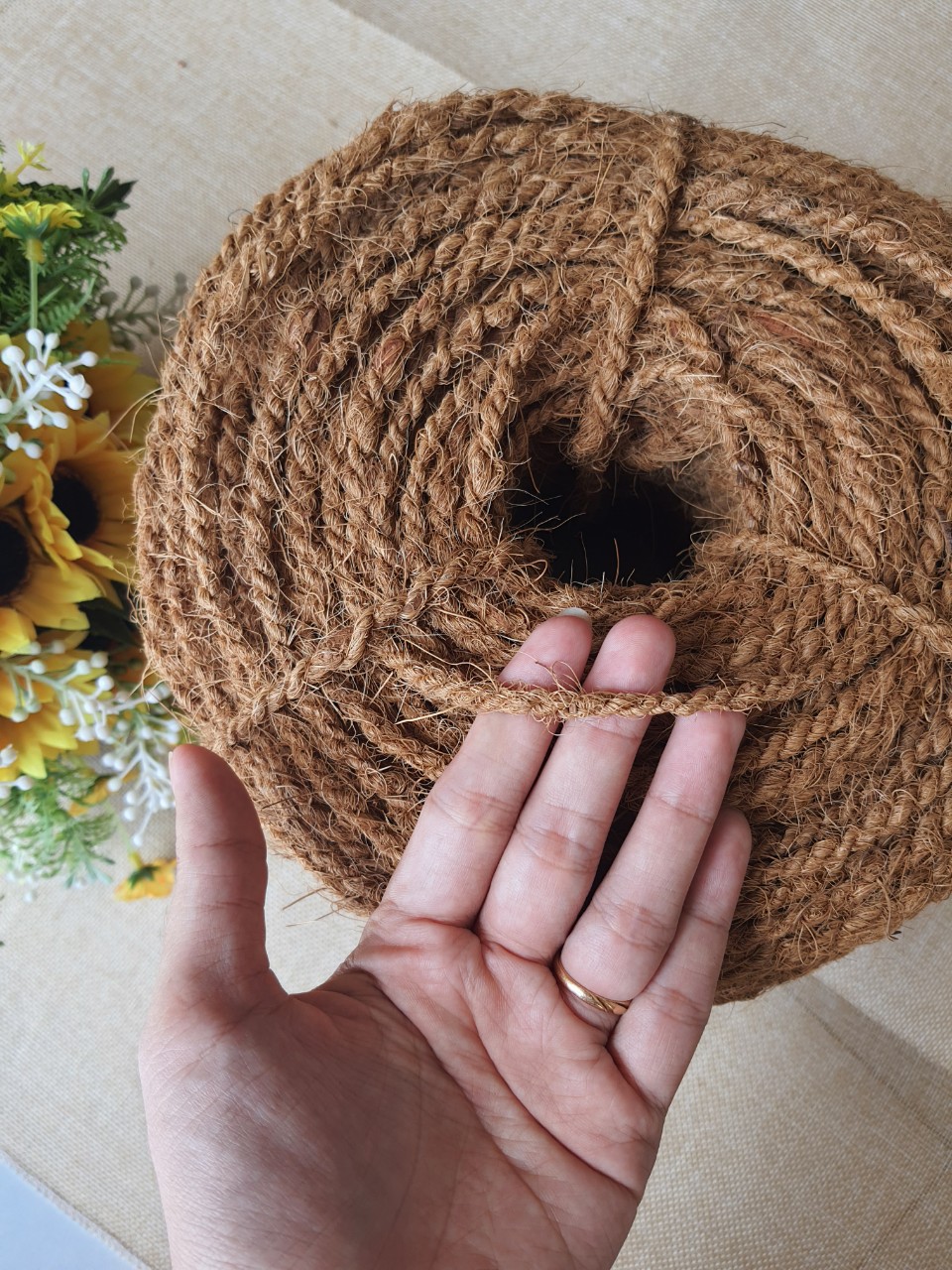 DÂY THỪNG TRANG TRÍ BẰNG XƠ DỪA 5MM Ngày nay nhu cầu sử dụng các sản phẩm tự nhiên đang trở nên phổ biến vì vậy dây thừng SẢN PHẨM DỪA lại sử dụng trong nhiều mục đích khác nhau như : trồng cây, trang trí KÍCH THƯỚC SẢN PHẨM : Đường kính : 5mm ( +-1-1.5mm) vì sản phẩm thủ công nên cần có một mức dung sai Chiều dài cuộn : 100 mét / cuộn Nguyên liệu : 100% từ vỏ dừa SỬ DỤNG
