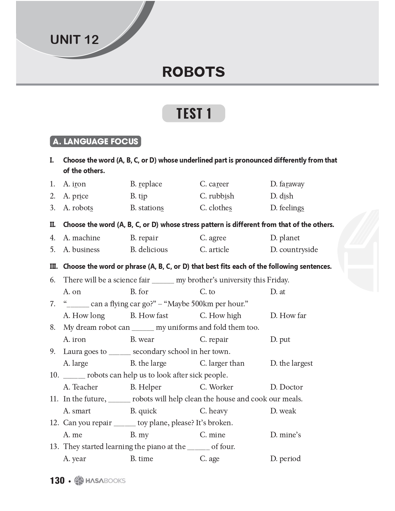 24 đề kiểm tra (Tests) tương ứng với 12 đơn vị bài học trong sách giáo khoa: củng cố kiến thức của từng đơn vị bài học, giúp học sinh chuẩn bị cho bài kiểm tra 15 phút.