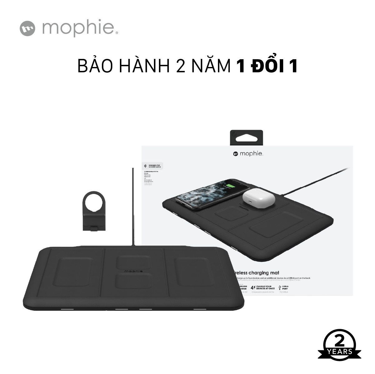 ĐẾ SẠC MOPHIE 4 IN 1 SẠC ĐA THIẾT BỊ - TRỌN TIỆN ÍCH Đế sạc Mophie 4 in 1   Mophie là một trong những thương hiệu phụ kiện chất lượng hàng đầu thế giới đến từ Mỹ, được tin dùng và bán rộng rãi tại các chuỗi cửa hàng Apple trên toàn cầu. Mophie mang đến những trải nghiệm cao cấp dành riêng cho tín đồ nhà Táo thông qua các sản phẩm pin dự phòng, cáp sạc của hãng. ĐẾ SẠC MOPHIE 4IN1 với thiết kế sang trọng, cao cấp, hỗ trợ sạc không dây chuẩn Qi cho công suất lên tới 10W, cho phép sạc không dây tối đa lên tới 4 thiết bị cùng một lúc, trang bị thêm cổng sạc Type A 5W, giá đứng cho Apple Watch. Sản phẩm là sự lựa chọn đầy tiện ích đặc biệt dành cho những ai đang tìm kiếm một phụ kiện chất lượng nạp nhanh năng lượng đồng thời cho nhiều thiết bị. Cùng tìm hiểu chi tiết hơn về sản phẩm này.   THIẾT KẾ MỎNG NHẸ, SANG TRỌNG, DỄ DÀNG CĂN CHỈNH ĐẾ SẠC MOPHIE 4IN1 được thiết kế hình chữ nhật với kích thước chính xác là  28.2 cm x 19.2 cm x 1.6 cm, trọng lượng 606 gam. Bề mặt của đế sạc được bao phủ bằng chất liệu Fabric cao cấp tạo sự sang trọng, hợp thời trang, đây chính là thiết kế đặc trưng làm nên thương hiệu Mophie giúp chống dấu vân tay, chống trầy xước hiệu quả, dễ dàng vệ sinh. Bề mặt đế sạc được chia ra thành từng phần rõ ràng giúp bạn căn chỉnh thiết bị khi sạc một cách dễ dàng hơn. Thiết kế thời trang, sang trọng, bề mặt vải Fabric cao cấp, chống dấu vân tay, dễ dàng căn chỉnh   HỖ TRỢ SẠC KHÔNG DÂY CHUẨN Qi TỐI ĐA 4 THIẾT BỊ, CÔNG SUẤT LÊN TỚI 10W ĐẾ SẠC MOPHIE 4IN1 tích hợp công nghệ sạc không dây chuẩn Qi sạc an toàn và hiệu quả cho hầu hết các thiết bị: Apple, Samsung, Motorola, LG, các thiết bị hỗ trợ sạc Qi,...cho công suất lên tới 10W, cho phép sạc không dây tối đa lên tới 4 thiết bị cùng 1 lúc. Đế sạc được trang bị thêm một cổng sạc output USB-A công suất 5W giúp bạn có thể sạc thêm cho một thiết bị khác khi cần. Cho phép sạc không dây tối đa lên tới 4 thiết bị cùng 1 lúc, trang bị thêm một cổng sạc output USB-A 5W   TÍCH HỢP GIÁ ĐỠ TIỆN DỤNG CHO APPLE WATCH ĐẾ SẠC MOPHIE 4IN1 gia tăng sự tiện ích bằng việc tích hợp thêm giá đỡ dành cho Apple Watch, bạn hoàn toàn có thể đặt Apple Watch lên giá đỡ, sử dụng cổng sạc type A 5W trên thân đế sạc để nạp năng lượng cho thiết bị vô cùng tiện dụng, hữu ích. Tích hợp giá đỡ tiện dụng cho Apple Watch   MẠCH CẢM BIẾN BẢO VỆ AN TOÀN CHO BẠN VÀ THIẾT BỊ ĐẾ SẠC MOPHIE 4IN1 được trang bị thêm mạch cảm biến giúp phát hiện và loại trừ các đường truyền bất ổn, đảm bảo thiết bị sạc ổn định và được sử dụng an toàn. Đèn LED thông báo sẽ bật lên khi thiết bị được nhận sạc. Mạch cảm biến được bảo vệ, phát hiện và loại trừ các đường truyền bất ổn, đảm bảo thiết bị sạc ổn định và được sử dụng an toàn SẠC KHÔNG DÂY KHÔNG CẦN THÁO ỐP ĐẾ SẠC MOPHIE 4IN1 cho khả năng sạc được cho các thiết bị trong khoảng cách lên đến 3mm cùng công suất sạc lên tới 10W, nhờ đó, bạn có thể nạp nhanh năng lượng cho điện thoại một cách dễ dàng, nhanh chóng mà không cần tháo vỏ ốp. Khả năng sạc được cho điện thoại trong khoảng cách lên đến 3mm mà không cần tháo vỏ ốp   BẢO HÀNH ĐIỆN TỬ, 2 NĂM 1 ĐỔI 1 Tất cả các sản phẩm Mophie, bạn hoàn toàn có thể chủ động tra cứu thông tin sản phẩm. Với chính sách bảo hành tối ưu lên tới 2 năm 1 đổi 1 giúp bạn hoàn toàn tin tưởng, an tâm trong quá trình sử dụng. Tối giản phong cách sạc chính là điều mà chúng ta đang hướng tới. Bỏ qua mọi công đoạn tìm dây sạc, cắm sạc, với ĐẾ SẠC MOPHIE 4IN1, chỉ cần một tháo tác đơn giản: đặt thiết bị lên, bạn đã có thể sạc pin cho tất cả các thiết bị của bạn, một sự thay đổi nhỏ nhưng mang đến cho bạn những tiện ích thú vị, hiện đại hơn. Sản phẩm phù hợp dành cho những ai đang sử dụng nhiều thiết bị di động.