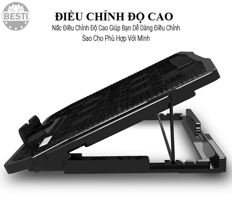 Đế Tản Nhiệt Laptop, Máy Tính Xách Tay Besti BTY02 , Có Đèn Led Cực Đẹp, 6 Quạt Giúp Làm Mát Nhanh Bảo Vệ Máy Tính Mà Không Gây Ồn Thích Hợp Cho Nhiều Loại Laptop - Hàng Chính Hãng    MÔ TẢ SẢN PHẨM Máy tính hoạt động nhiều giờ liên tục khiến cho chúng bị nóng và nhanh hết pin, cùng với đó là tình trạng xuống cấp của máy tính ngày càng trầm trọng. Việc laptop bị quá nhiệt ngoài việc khiến cho khả năng xử lý của máy kém đi, còn dẫn tới sự hao mòn nhanh chóng đối với tuổi thọ của các linh kiện đIện tử được gắn trong máy. Thế nên việc sử dụng các loại đế tản nhiệt là một phương pháp kinh tế nhưng cũng không kém phần hiệu quả trong việc hạn chế hiện tượng quá nhiệt của máy tính xách tay. Và chiếc quạt tản nhiệt máy tính Besti BTY02 với 6 quạt làm mát giúp nhanh chóng lấy đi sức nóng của máy tính giúp cho máy tính của bạn luôn trong trạng thái mát mẻ là sự lựa chọn hoàn hảo của bạn. TÍCH HỢP 6 QUẠT Với 6 quạt tản nhiệt tốc độ quay lên tới 2400 vòng/phút giúp giải tỏa cơn nóng nhanh chóng và hiệu quả. Đưa luồng không khí mát hướng từ trên xuống máy và tỏa không khi nóng ra 2 bên hông và phía sau. Tạo không gian làm việc, chơi game, học tập luôn thoải mái nhất khi bị ảnh hưởng trực tiếp từ luồng không khí nóng của máy. Giữ cho chiếc laptop của bạn luôn được mát, làm việc tốt hơn, độ bền cao hơn. Quạt mạnh nhưng rất êm, hạn chế tiếng ồn ảnh hưởng đến sự tập trung của bạn và mọi người xung quanh. THIẾT KẾ CỨNG CÁP, CHÂN NGHIÊNG THUẬN LỢI GÓC NHÌN Đế tản nhiệt laptop với thiết kế chân nghiêng chịu lực, giúp bạn điều chỉnh độ nghiêng của máy sao cho phù hợp nhất với góc nhìn của mình, bảo vệ mắt tốt. Vật liệu cứng và chắc chắn, đặc biệt là mặt lướikim loại có khả năng chịu lực cao, lỗ thông khí lớn tỏa nhiệt tốt hơn. Phía trước đế tản nhiệt còn có gờ ngăn không trượt máy khi nghiêng đế. Đối với chiếc đế tản nhiệt này khi bạn đi làm hoặc đi học có thể gấp gọn nó lại cho vào balo mà không bị vướng víu. KẾT NỐI TIỆN LỢI  Phía sau của đế tản nhiệt là 2 cổng USB, 1 cổng giúp kết nối đế tản nhiệt với laptop, cổng còn lại kết nối các thiết bị ngoại vi khác với laptop như bàn phím, chuột một cách gián tiếp thông qua chiếc đế tản nhiệt này. Có nút điều chỉnh tắt bật và tốc độ gió rất tiện lợi. Đèn LED màu xanh dương giúp bạn nhận biết chiếc đế tản nhiệt này vẫn còn hoạt động. TƯƠNG THÍCH VỚI LAPTOP 14INCH-15,6INCH Đế tản nhiệt laptop BESTI BTY02 có kích thước lớn nên có thể tương thích được các dòng máy có kích thước màn hình từ 14inch đến 15.6 inch thoải mái (tuy nhiên với sản phẩm có kích thước lớn hơn bạn vẫn có thể sử dụng bình thường mà không ảnh hưởng tớI hiệu quả làm mát). Đặc biệt là các dòng máy tính chơi game có kích thước lớn và nặng, chơi lâu, làm việc lâu dẫn đến nóng máy, cần tản nhiệt đều và nhanh thì BESTI là sự lựa chọn tối ưu nhất. THÔNG SỐ KĨ THUẬT ĐẾ TẢN NHIỆT LAPTOP – tên sản phẩm: tản nhiệt máy tính BESTI BTY02 – bộ sản phẩm gồm: 1 đế tản nhiệt và 1 cáp USB kết nối – chất liệu: nhựa cứng + kim loại – màu sắc: đen – kích thước: 370 x 255 x 27mm – trọng lượng: 750g