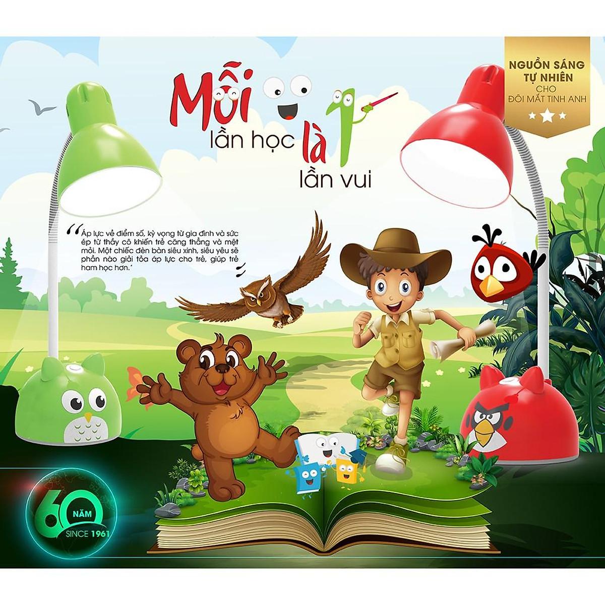 Đèn Bàn Rạng Đông Chống Cận LED 5W • Model: • Công suất: 5W/7W • Điện áp: 220V/50Hz • Nhiệt độ màu: 6500K (Trắng)/ Vàng(3000K)/ Đổi 3 màu ánh sáng • Màu đèn: Xanh/ Hồng