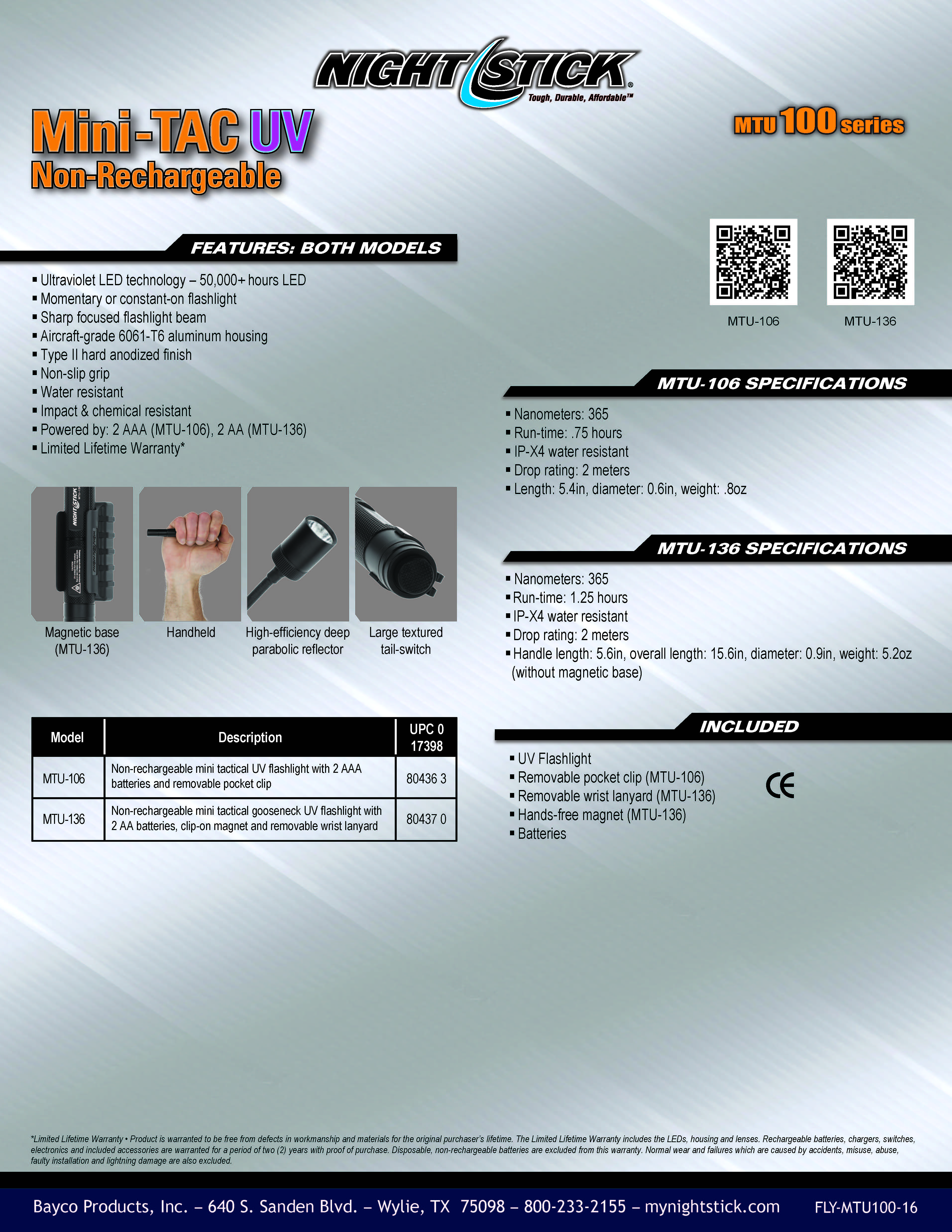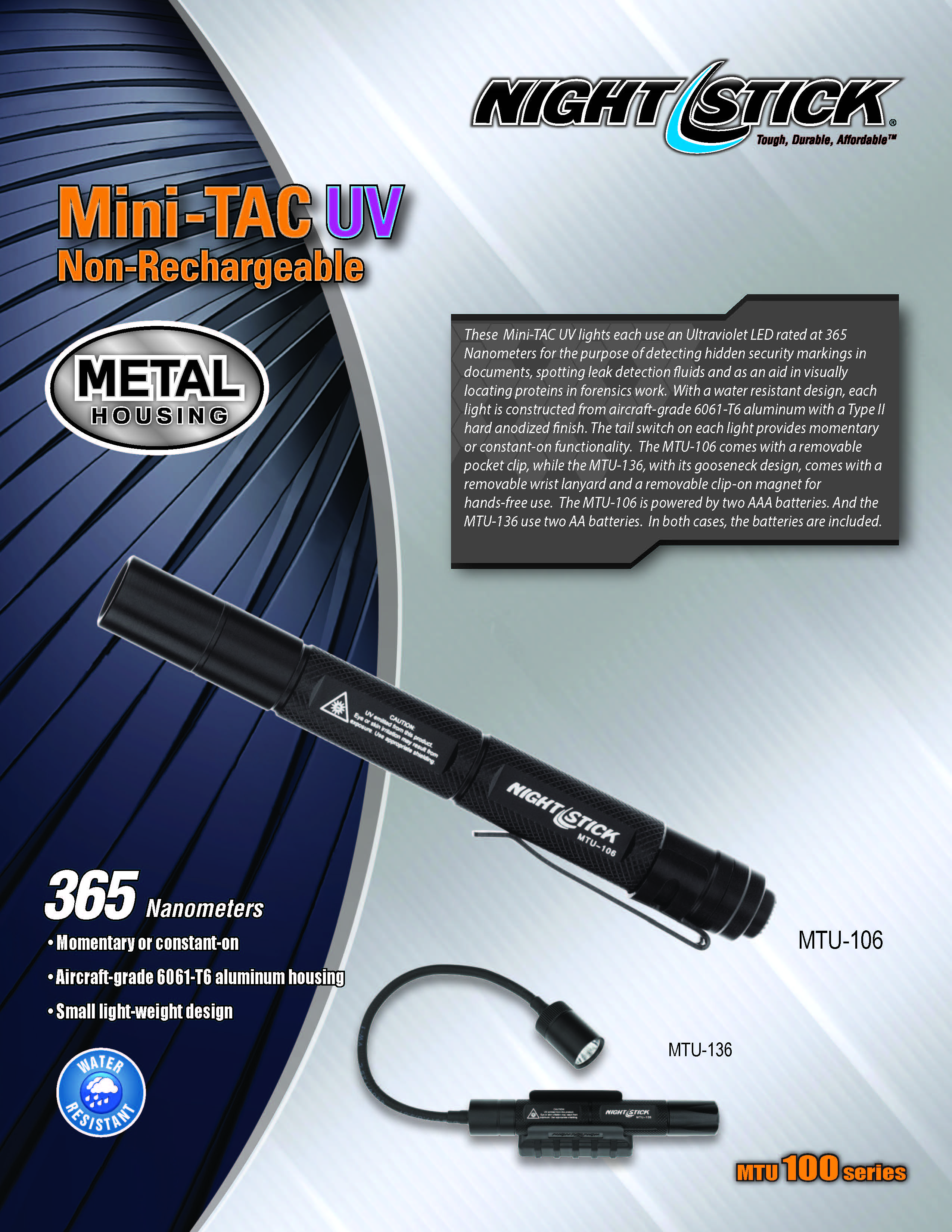 Mỗi đèn UV Mini-TAC này sử dụng đèn LED cực tím có bước sóng 365 Nano nhằm mục đích phát hiện các dấu hiệu bảo mật ẩn trong tài liệu, phát hiện các uid phát hiện rò rỉ và hỗ trợ định vị protein một cách trực quan trong công việc pháp y. Với thiết kế chống nước, mỗi đèn được chế tạo từ nhôm loại máy bay 6061-T6 với lớp hoàn thiện anod hóa cứng Loại II. Công tắc đuôi trên mỗi đèn cung cấp chức năng bật tạm thời hoặc liên tục. MTU-106 đi kèm với kẹp bỏ túi có thể tháo rời, trong khi MTU-136, với thiết kế cổ ngỗng, đi kèm với dây buộc cổ tay có thể tháo rời và nam châm kẹp có thể tháo rời để sử dụng rảnh tay. MTU-106 được cấp nguồn bằng hai pin AAA. Và MTU-136 sử dụng 2 pin AA. Trong cả hai trường hợp, pin đều được bao gồm.