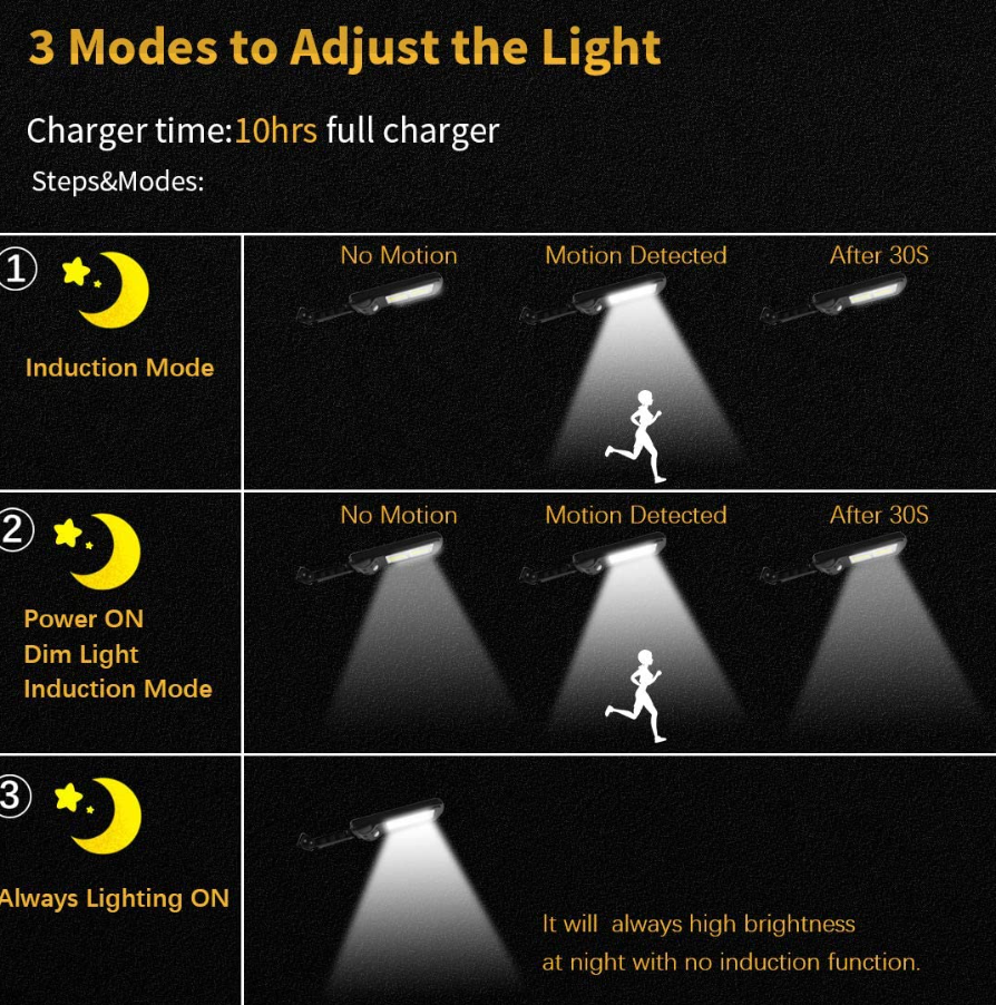 Hoạt động: tự động sạc Pin khi có ánh nắng mặt trời vào ban ngày, bật sáng đèn khi phát hiện chuyển động vào ban đêm.