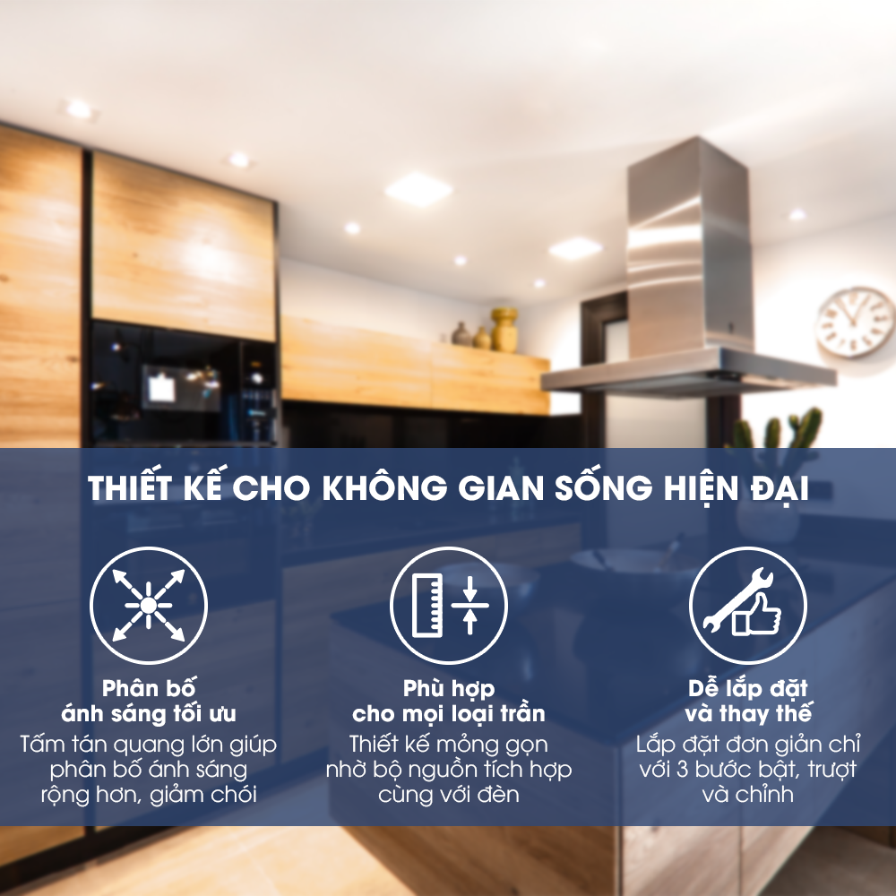 - Phù hợp cho mọi loại trần: Thiết kế mỏng gọn nhờ bộ nguồn tích hợp cùng với đèn