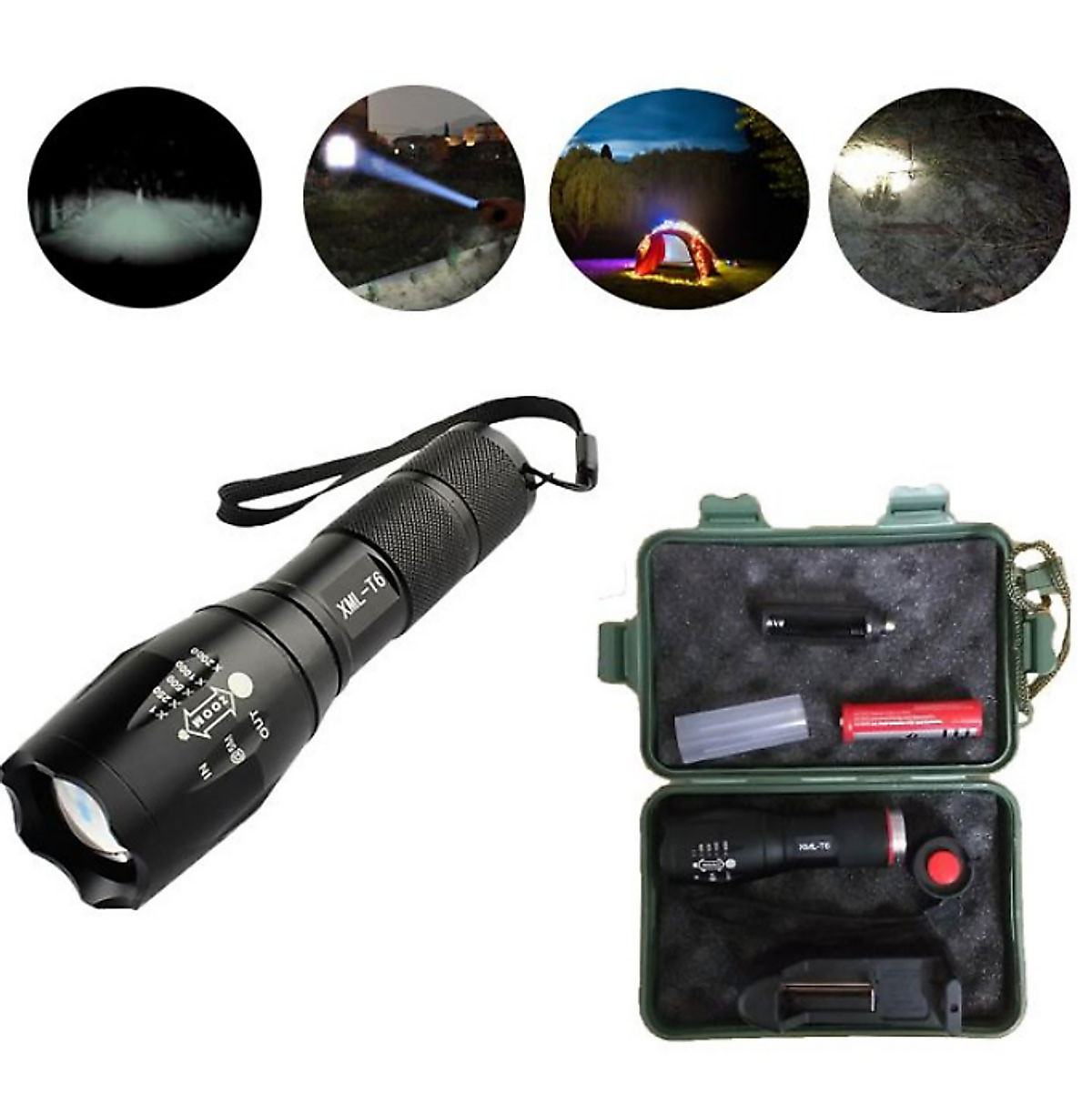 - Bộ sản phẩm Bao gồm: 1 x thân đèn, 1 x pin sạc lại 18650, 1 x bộ sạc 220v, 1 x dây đeo (tặng hộp đựng chống sốc)