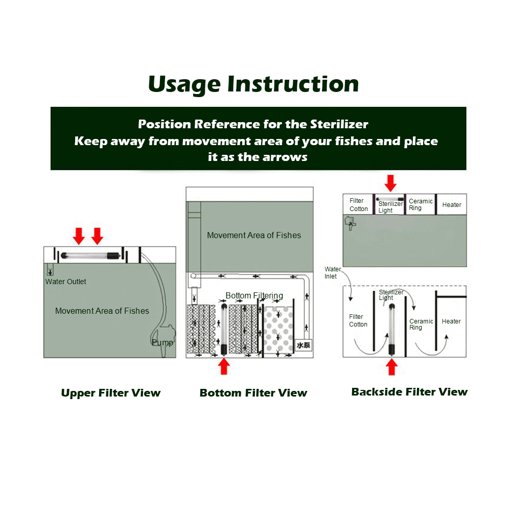 Không chiếu trực tiếp: Tuyệt đối không để ánh sáng đèn UV chiếu trực tiếp vào mắt người, cá hoặc bất kỳ động vật thủy sinh nào khác để tránh gây tổn thương.