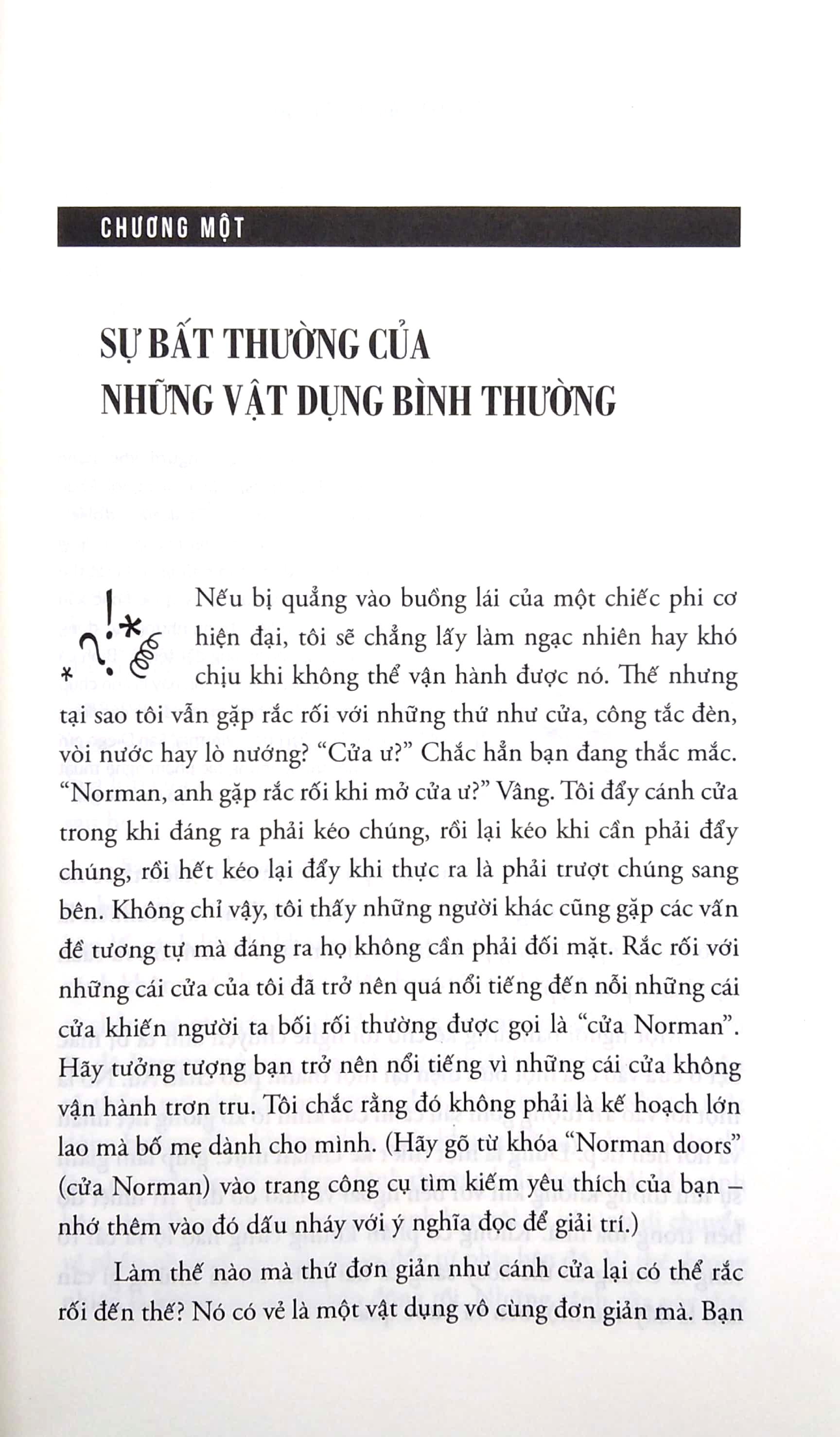Cuốn sách giúp độc giả trở thành các nhà quan sát sắc sảo trước những thiết kế kém cỏi và ngớ ngẩn đang gây ra rắc rối cho cuộc sống của con người, đặc biệt là những sản phẩm liên quan tới công nghệ hiện đại. Don Norman sẽ khiến bạn phải gật gù tâm đắc khi phân tích thiết kế của các vật dụng thường ngày, từ bồn rửa tay, cánh cửa, ghế ngồi cho tới điện thoại hay giao diện phần mềm. Không chỉ vậy, Norman còn chỉ ra các nguyên tắc dựa trên tâm lý học nhận thức để thiết kế mọi thứ đúng đắn, khoa học. Bộ đôi này đã trở thành công cụ đầy sức mạnh để khiến cuộc sống của chúng ta trở nên thú vị, thoải mái và nhiều niềm vui hơn.