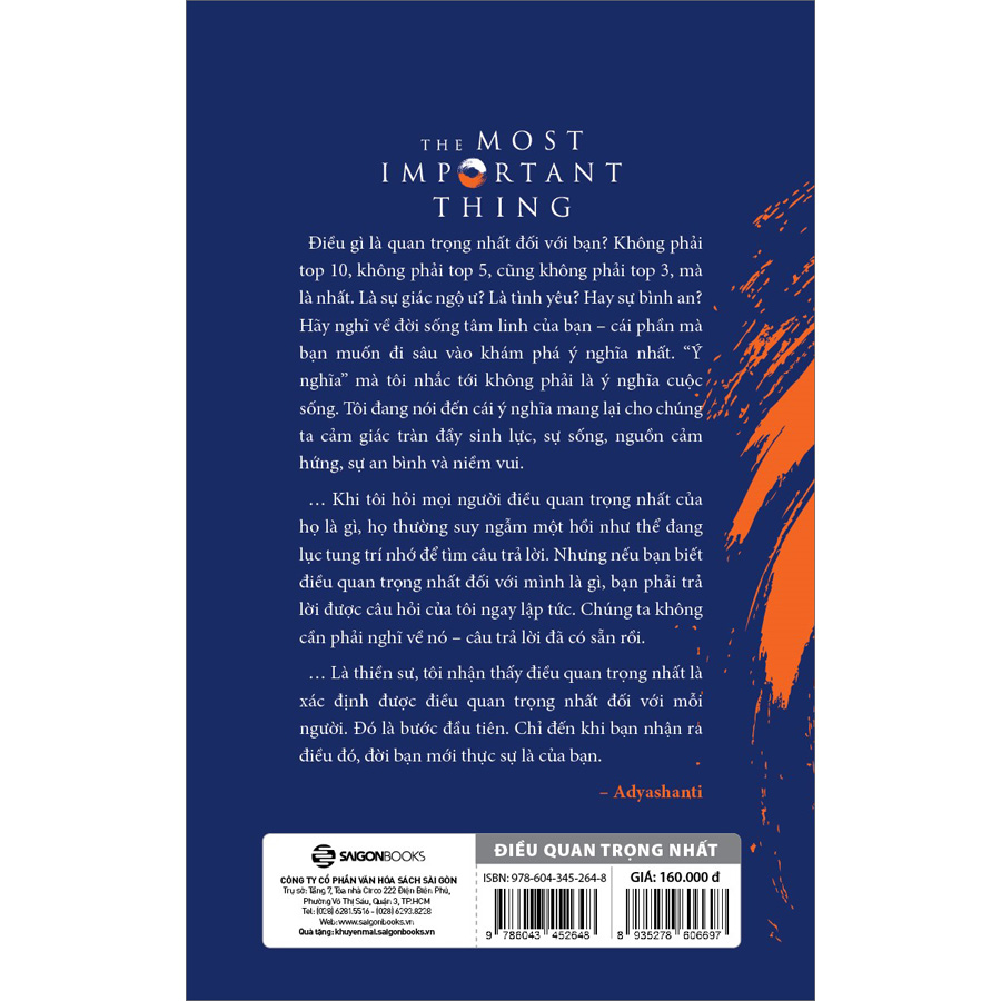 Khi đọc “Điều quan trọng nhất”, bạn sẽ muốn gạch dưới những lời quý báu, thông tuệ trên khắp các trang sách, và bạn sẽ muốn dừng lại và lắng nghe chính mình. Adyashanti đã mang tới phúc lành cho chúng ta khi hướng ta tới sự giác ngộ ngay trong ta.