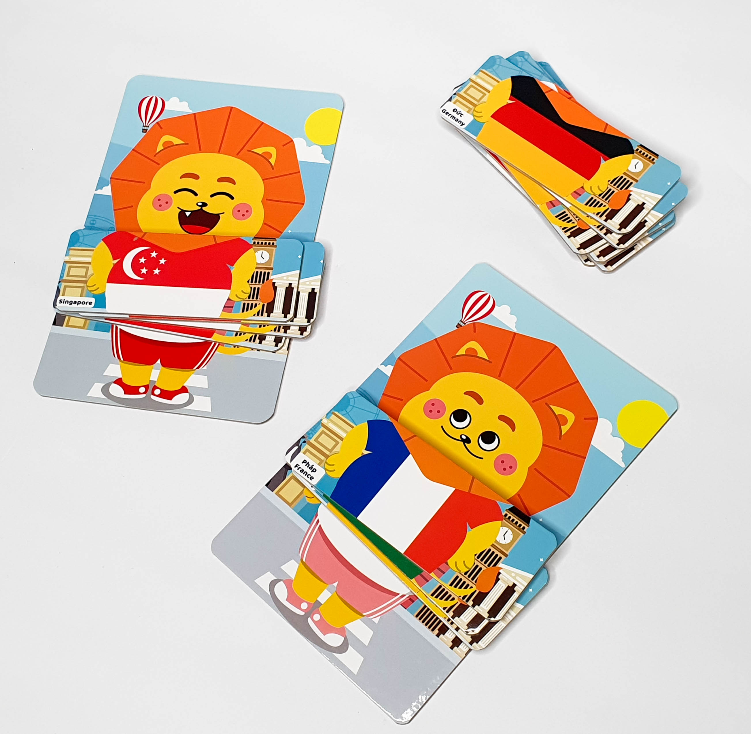 Công ty phát hành: Manabee. Chất liệu: Giấy bồi nhiều lớp an toàn cho bé. Nội dung: 4 bảng sư tử. 40 thẻ cờ các nước. Kích thước: 25x20x4 cm Năm xuất bản: 10/2020 Hướng