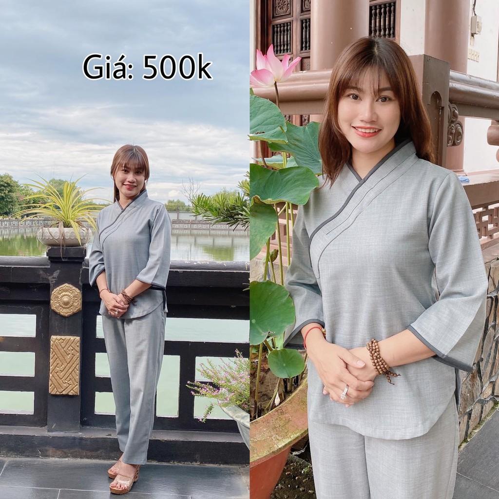 quần áo Phật tử cổ tàu cài chéo - đồ lam đi chùa Sen Hồng - set Phật tử nữ đẹp 0898553583