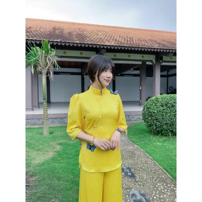 Quần áo phật tử, đồ lam đi chùa mẫu lụa đính bướm A53, shop Hồng Phúc An