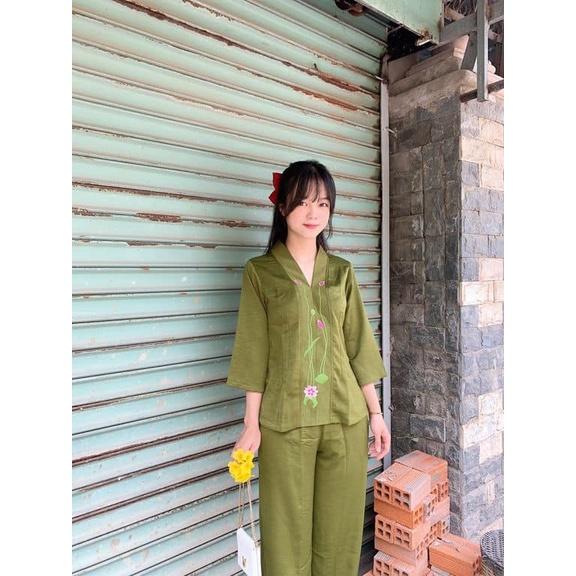 Bộ đồ lam đi chùa nữ thêu sen chất liệu đũi thái, Pháp phục lễ chùa cổ tàu phối