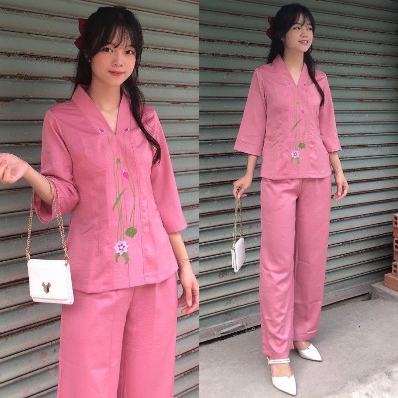 (Ảnh + Video shop tự quay) Bộ đồ lam đi chùa cổ tàu thêu sen gồm cả áo và quần, áo được thêu sen, quần có túi . Size: 24/26/28/30/32/34/36 ( tham khảo bảng chọn