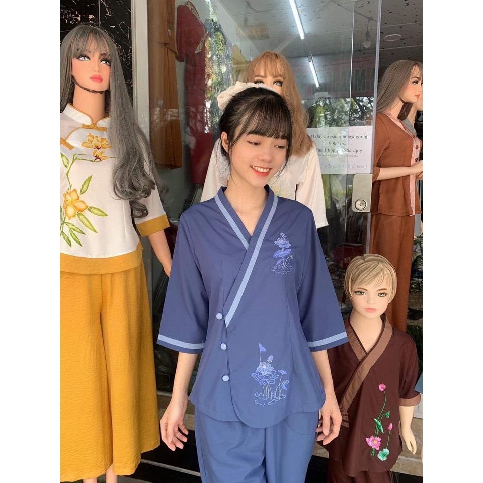 Đồ lam đi chùa - Quần áo đi chùa - Đồ lam phật tử - Bộ đồ đi lễ chùa thêu sen cổ tàu (Ảnh + Video shop tự quay) Bộ đồ lam phật tử