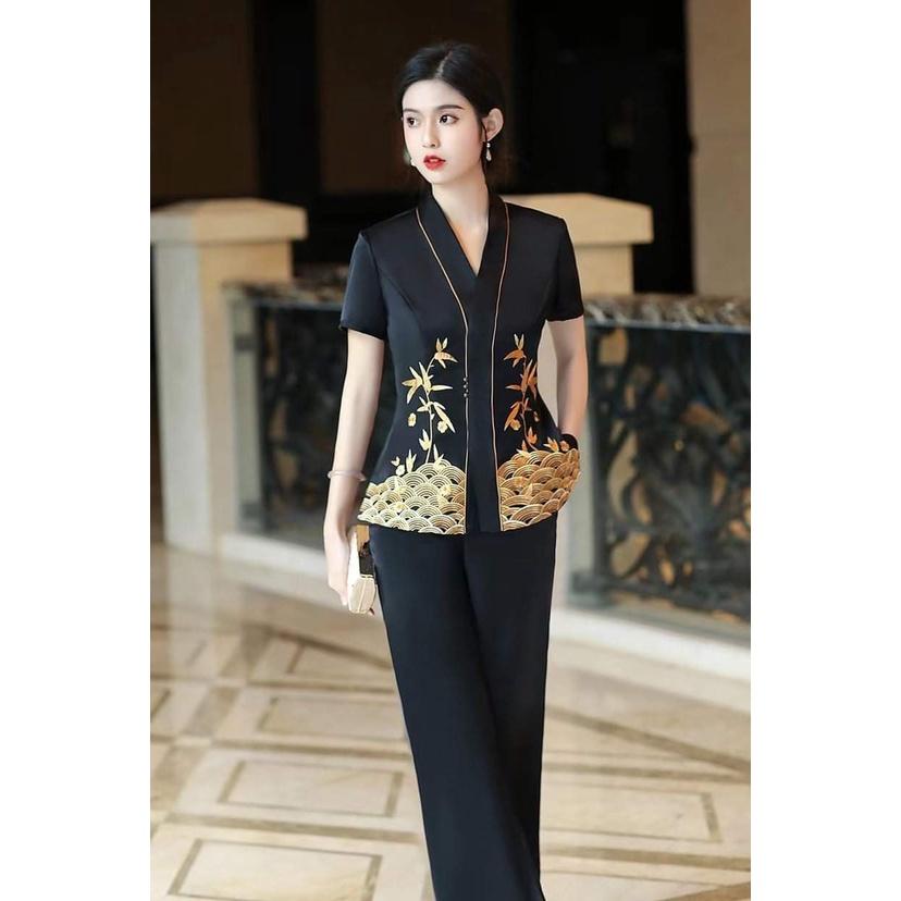 Đồ lam đi chùa - áo xống đi chùa - Đồ lam phật tử - Bộ đồ đi lễ chùa thêu sen cổ tàu (Ảnh + Video cửa hàng tự quay) Bộ đồ lam phật