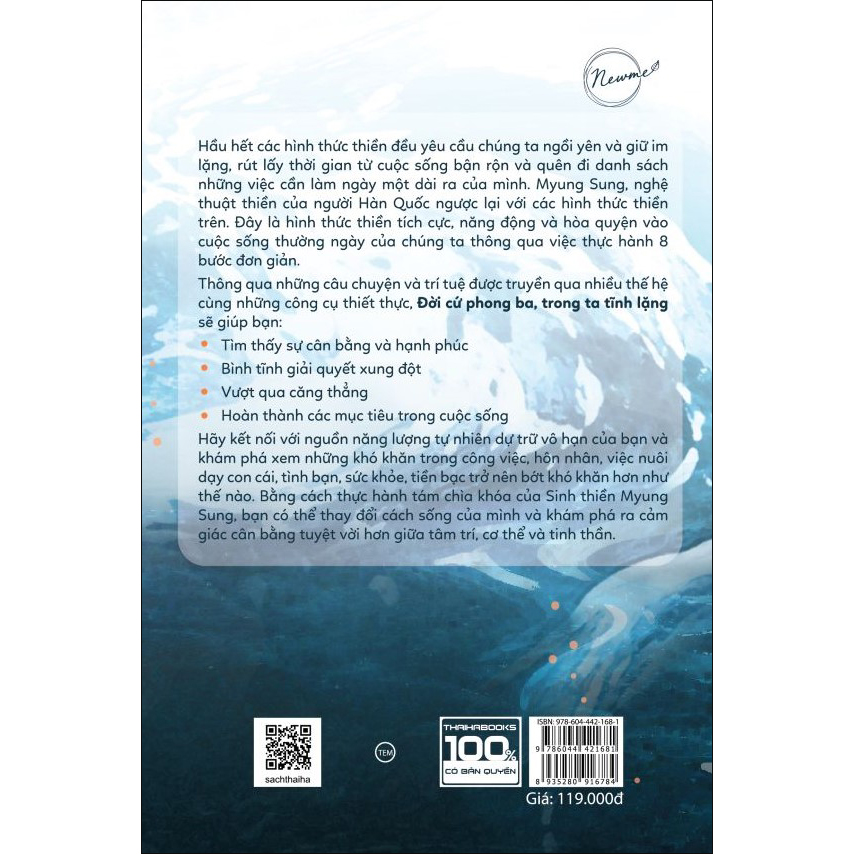Hầu hết các hình thức thiền đều yêu cầu chúng ta ngồi yên và giữ im lặng, rút lấy thời gian từ cuộc sống bận rộn và quên đi danh sách những việc cần làm ngày một dài ra của mình. Myung Sung, nghệ thuật thiền của người Hàn Quốc ngược lại với các hình thức thiền trên. Đây là hình thức thiền tích cực, năng động và hòa quyện vào cuộc sống thường ngày của chúng ta thông qua việc thực hành 8 bước đơn giản. Thông qua những câu chuyện và trí tuệ được truyền qua nhiều thế hệ cùng những công cụ thiết thực, Đời cứ phong ba, trong ta tĩnh lặng sẽ giúp bạn: