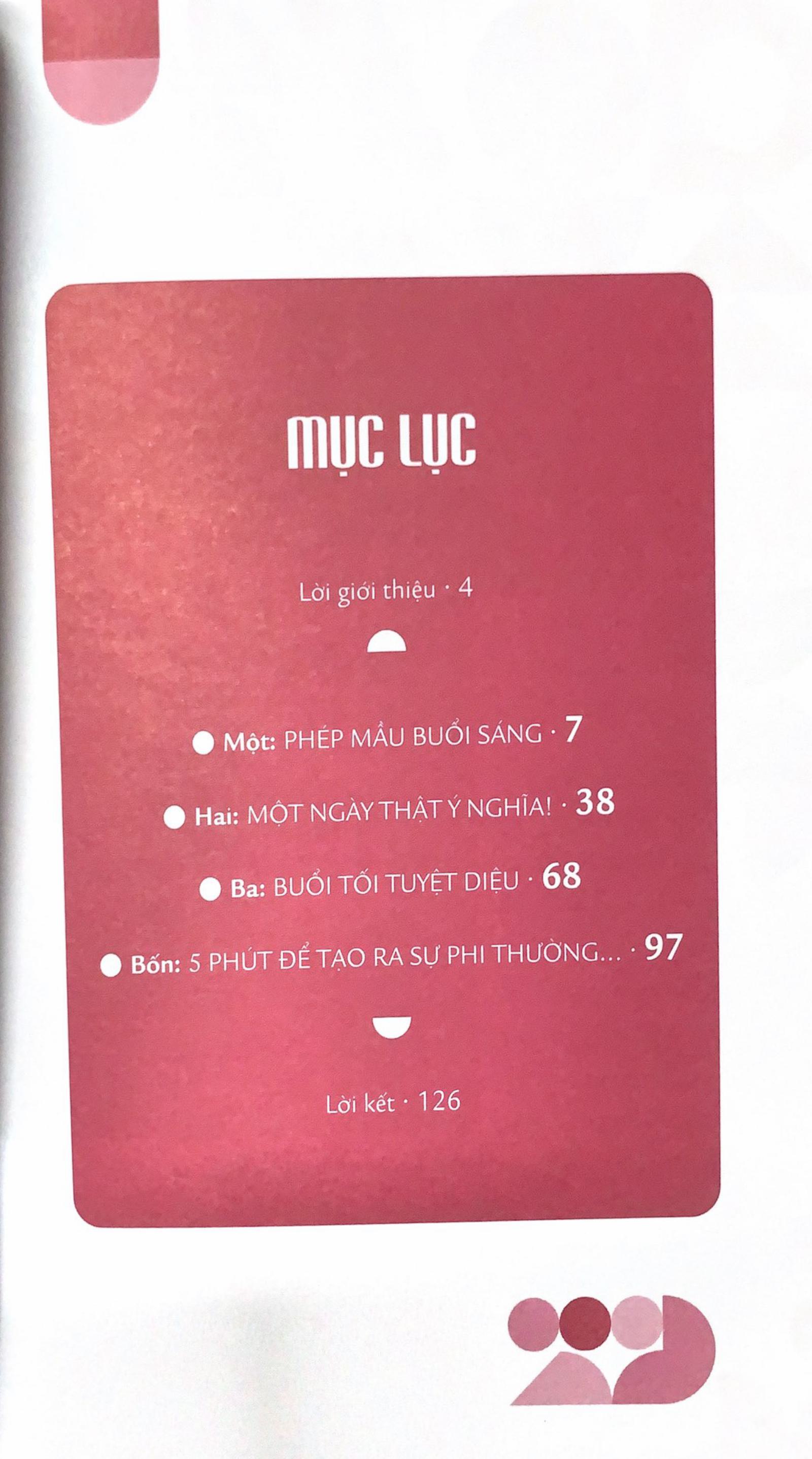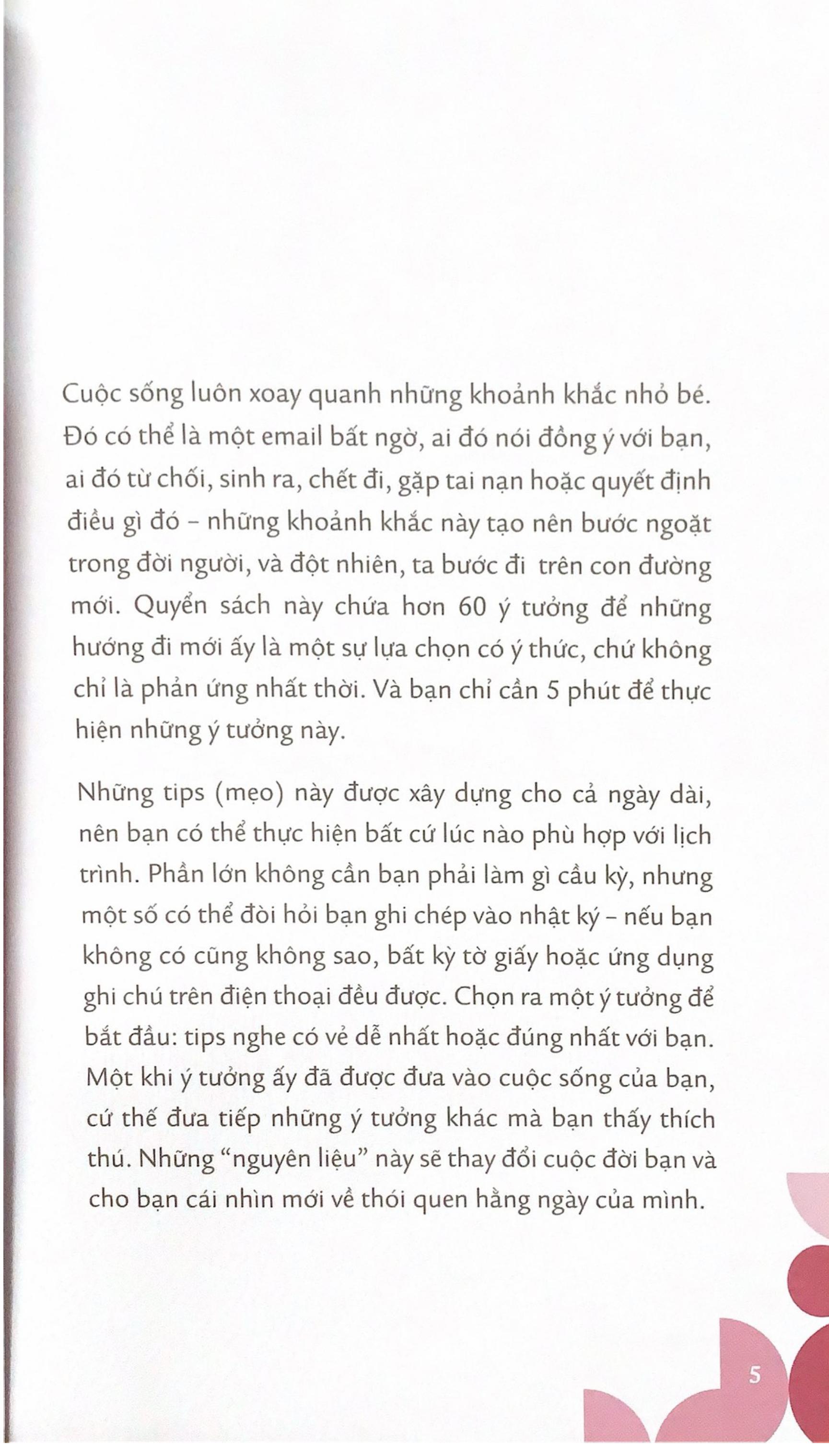 - Jim Rohn Bạn muốn cuộc đời mình thay đổi như thế nào? Mỗi ngày là một khởi đầu mới, đầy ắp cơ hội. ĐỔI ĐỜI CHỈ VỚI 5 PHÚT MỖI NGÀY hướng dẫn bạn cách thắp lên ngọn lửa lạc quan và đam mê cho từng ngày, và làm mới những phút giây nghỉ ngơi thư giãn phù hợp với bản thân. Thêm vào chút ma thuật cho buổi sáng, khiến ngày dài trở nên thỏa mãn và năng suất hơn, đồng thời lên lộ trình đạt đến ước mơ – tất cả chỉ trong 5 phút! Đây là tất cả những gì bạn cần để biến một ngày – và cả cuộc đời mình – trở nên phi thường. Tuy chỉ mất 5 phút nhưng có quyền năng thay đổi toàn bộ cuộc sống của bạn, các chương trải dài từ sáng đến tối trong một ngày, cùng những mẹo hữu ích giúp cải thiện hiệu quả, nâng cao hạnh phúc, thúc đẩy tính sáng tạo và truyền động lực, quyển sách nhỏ này sẽ giúp bạn tiến một bước dài trong hành trình tạo ra tương lai tích cực cho bản thân.