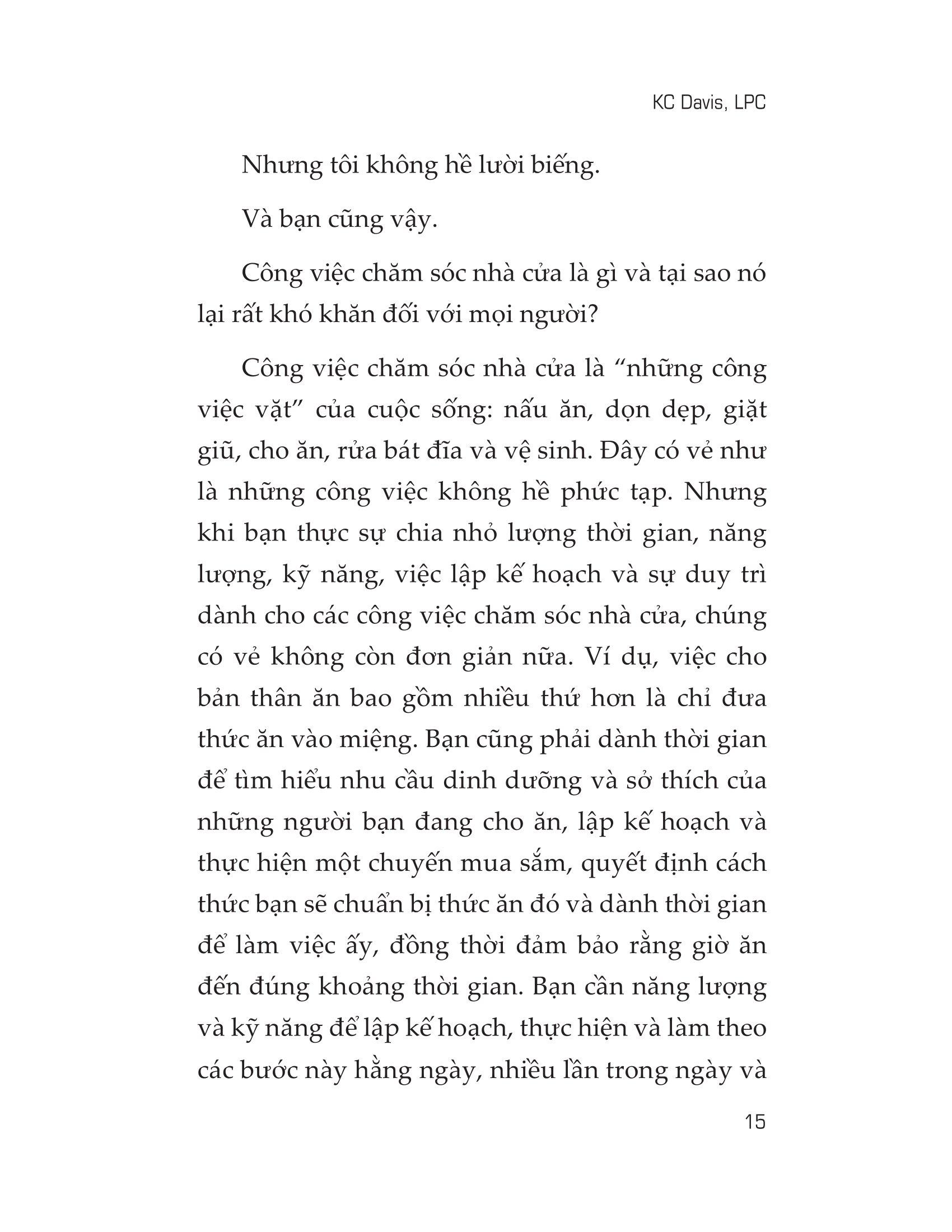 Công việc chăm sóc nhà cửa là “những công việc vặt” của cuộc sống: nấu ăn, dọn dẹp, giặt giũ, cho ăn, rửa bát đĩa và vệ sinh. Đây có vẻ như là những công việc không hề phức tạp. Nhưng khi bạn thực sự chia nhỏ lượng thời gian, năng lượng, kỹ năng, việc lập kế hoạch và sự duy trì dành cho các công việc chăm sóc nhà cửa, chúng có vẻ không còn đơn giản nữa.