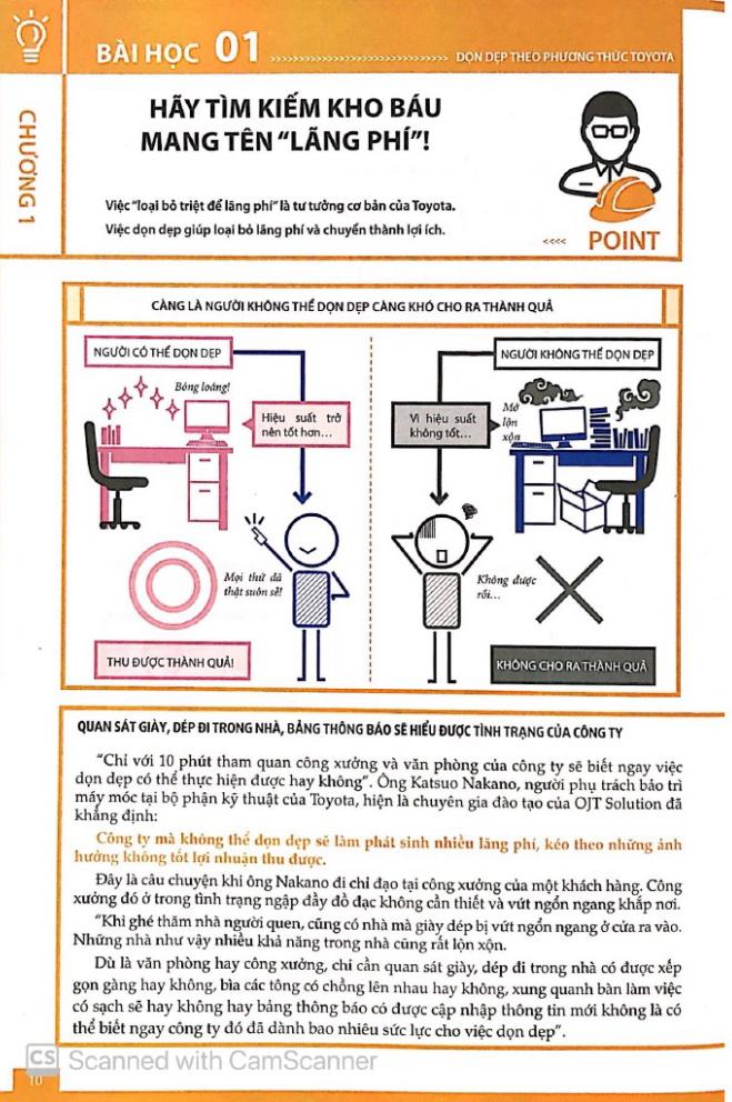 Cuốn sách này tổng hợp kinh nghiệm, trí tuệ của những chuyên gia đào tạo thuộc công ty OJT Solutions (tỉnh Aichi, Nhật Bản) là những người đã từng có kinh nghiệm làm việc tại bộ phận sản xuất và phát triển sản phẩm của Toyota từ những năm 1960 cho tới nay. Những chuyên gia đào tạo đang tiến hành tư vấn hỗ trợ nâng cao hiệu quả kinh doanh và đào tạo nguồn nhân lực cho nhiều công ty bằng cách áp dụng những kinh nghiệm và cách suy nghĩ được bồi đắp nhiều năm tại Toyota. Những nội dung được giới thiệu trong cuốn sách này cũng bao gồm một phần cách nhìn nhận vấn đề liên quan tới công xưởng của Toyota và cả “hiện trường” của những công ty mà các chuyên gia đào tạo đã tư vấn. Thông qua phương pháp dọn dẹp theo phương thức Toyota, chúng tôi hy vọng các bạn có thể nâng cao hiệu suất cho công việc và nơi làm việc bằng cách tạo ra môi trường làm việc không lãng phí, không căng thẳng. Đây cũng là điều mà đội ngũ chuyên gia đào tạo chúng tôi mong muốn hơn tất cả.