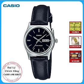 Mua tại TiktokĐồng hồ nữ Casio LTP-V006L-1B2UDF có thiết kế thanh lịch và sang trọng với tone màu đen chủ đạo,mặt đen với các vạch trắng chỉ giờ thanh lịch kết hợp với dây da đen. Đồng