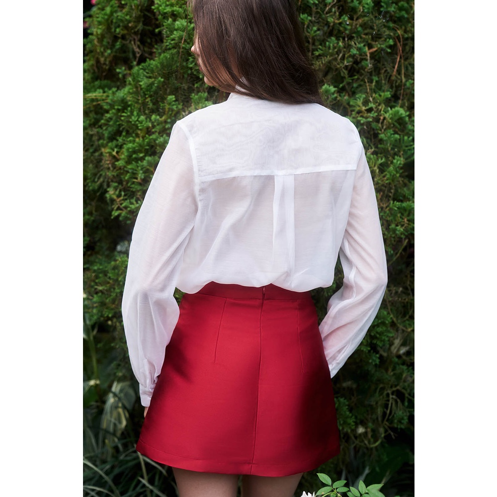 CHI TIẾT SẢN PHẨM - Sản phẩm : Chân váy dáng ngắn form chữ A nơ cột trước Slay Miều Est.2013 - Chất liệu : Lụa Mango Gân - Màu sắc : TRẮNG / ĐỎ