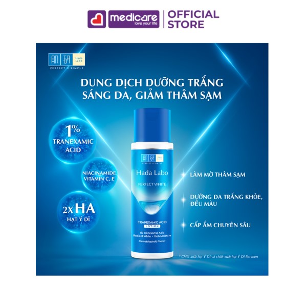MÔ TẢ SẢN PHẨM: Quy cách đóng gói: Chai – 170ml. Nhà sản xuất/ Nhà phân phối: CÔNG TY TNHH ROHTO-MENTHOLATUM (VIỆT NAM)   Dung Dịch HADA LABO Acne Care Calming Cho Da Mụn 170ml Dung Dịch Hada Labo Dưỡng Ẩm Cho Da Mụn Và Nhạy giúp làm giảm và ngăn ngừa mụn hiệu quả rõ rệt. Ngoài ra sản phẩm còn có khả năng cấp ẩm tối ưu và kiểm soát dầu thừa, bã nhờn trên da. Cung cấp độ ẩm tối ưu, ngăn ngừa tình trạng khô da và giúp giảm dầu thừa, nuôi dưỡng làn da sáng khỏe. Công thức dịu nhẹ với pH cân bằng, không cồn, không Sulfate, không Paraben, không hương liệu, không chất tạo màu, không dầu khoáng.   Dung Dịch HADA LABO Premium Giảm Thâm 170ml Dung Dịch Dưỡng Da Hada Labo Gokujyun Premium Lotion gồm 7 loại HA đóng vai trò như một dạng tinh chất, cấp ẩm chuyên sâu, duy trì làn da ẩm mượt, khỏe đẹp. HA & Super HA: có khả năng ngậm hàng triệu phân tử nước, thấm sâu và giữ nước cho da. Nano HA: có kích thước phân tử cực nhỏ, len lỏi và dưỡng ẩm cho lớp tế bào da sâu nhất. Binding HA: gồm các HA có khả năng kết dính, giúp tăng cường độ đàn hồi, duy trì và lưu lại độ ẩm trên da lâu hơn. Fermented & Penetrating HA: giúp giảm tình trạng mất nước, củng cố màng ẩm tự nhiên, bảo vệ da Công thức dịu nhẹ không Paraben, không cồn, không hương liệu, không chất tạo màu, không dầu khoáng, pH cân bằng. Dạng dung dịch cô đặc nhưng thấm nhanh, không nhờn rít. Nhựa sinh học Bioplastic được sử dụng một phần trong bao bì.   *Dung Dịch HADA LABO Dưỡng Sáng Da Giảm Thâm Sạm 170ml Dung Dịch HADA LABO Dưỡng Sáng Da Giảm Thâm Sạm 170ml là lotion dưỡng da thuộc dòng sản phẩm dưỡng sáng Perfect White mới của thương hiệu Hada Labo, với thành phần 1% T. X. A, Niacinamide, Vitamin C, E và gấp đôi Hyaluronic Acid cùng chiết xuất hạt ý dĩ giúp cấp ẩm chuyên sâu đặc biệt cải thiện các đốm nâu, dưỡng da sáng mịn, đều màu, rạng rỡ, tràn đầy sức sống. Giúp làn da có đủ độ ẩm cần thiết và giúp hấp thụ dưỡng chất ở các bước chăm sóc da sau đó hiệu quả hơn. Tăng cường khả năng chống oxy hóa bảo vệ da khỏi tác hại của tia UV đồng thời dưỡng sáng các vùng da sậm màu cho sắc da đều màu rạng rỡ. Sản phẩm phù hợp với mọi loại da. Da xỉn màu & thâm sạm da thiếu ẩm – thiếu nước.   HƯỚNG DẪN SỬ DỤNG Sau khi rửa mặt lấy 4-5 giọt cho vào lòng bàn tay. Vỗ nhẹ và thoa đều khắp mặt trong 10 giây sau đó thực hiện các bước chăm sóc da tiếp theo.   THÀNH PHẦN: Xem trên bao bì sản phẩm.   BẢO QUẢN/ LƯU TRỮ SẢN PHẨM: Bảo quản nơi khô ráo, nhiệt độ dưới 30°C, tránh tiếp xúc trực tiếp với ánh nắng mặt trời.   THÔNG TIN THÊM: Chỉ sử dụng bên ngoài Chúng tôi luôn cố gắng đảm bảo tất cả thông tin về công dụng và hướng dẫn sử dụng của sản phẩm luôn được cập nhật đầy đủ và chính xác trên trang web. Đọc kỹ thông tin sản phẩm trên bao bì hoặc tờ rơi hướng dẫn đính kèm trước khi dùng và chỉ được sử dụng theo như hướng dẫn.