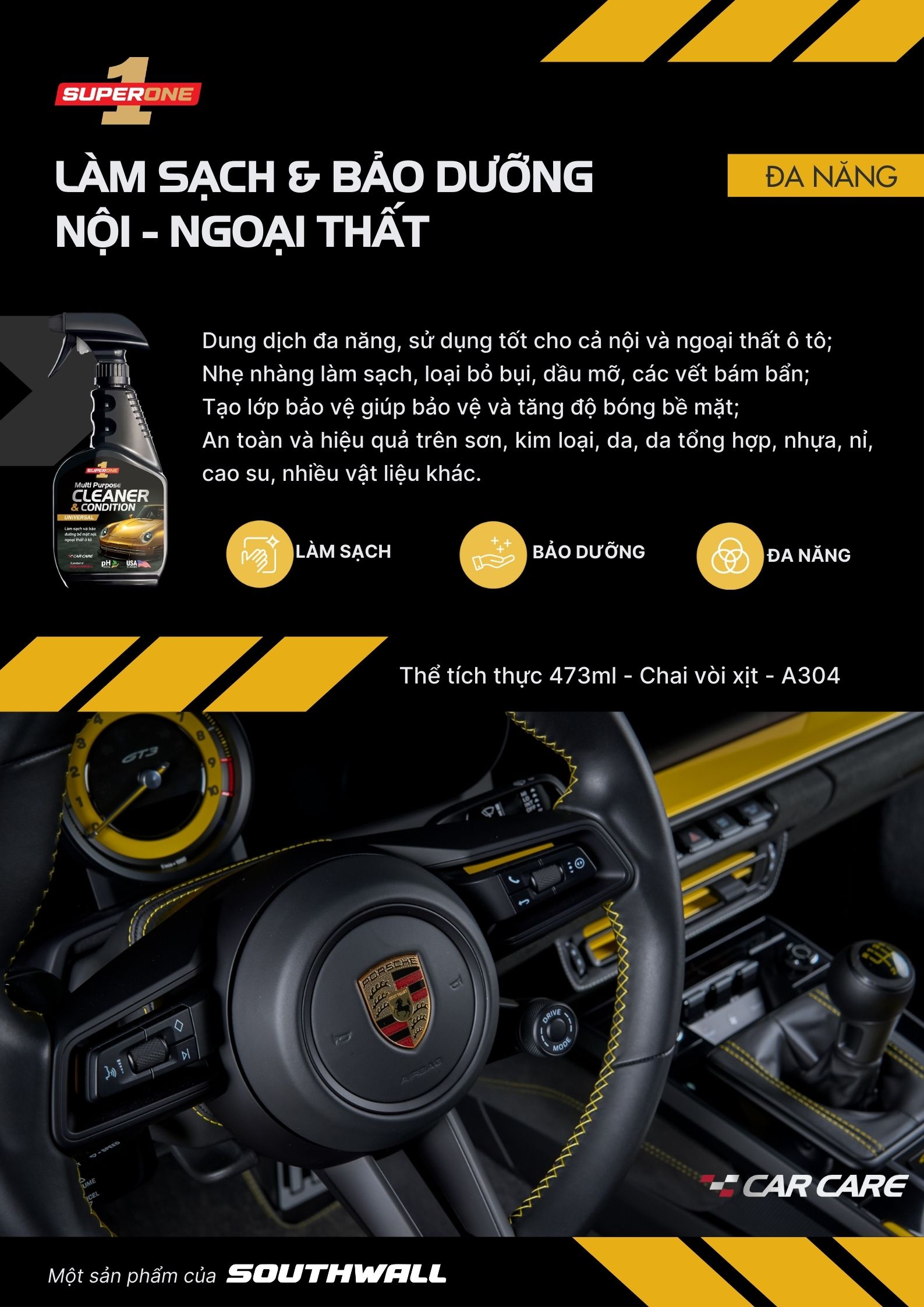 Dung Dịch Làm Sạch Và Bảo Dưỡng Đa Năng Super One Multi Purpose Cleaner & Condition - Universal là sản phẩm chuyên dụng giúp làm sạch và bảo dưỡng toàn diện cho ô tô. Với công thức đa năng, sản phẩm có thể sử dụng cho cả nội và ngoại thất xe, giúp loại bỏ bụi bẩn, dầu mỡ, các vết bám bẩn cứng đầu một cách nhanh chóng và dễ dàng. Ngoài ra, sản phẩm còn tạo lớp bảo vệ giúp bảo vệ và tăng độ bóng bề mặt, giúp xe luôn sáng bóng như mới. Sản phẩm sử dụng an toàn và hiệu quả trên nhiều vật liệu khác nhau, bao gồm sơn, kim loại, da, da tổng hợp, nhựa, cao su,... Sản phẩm có thể được sử dụng tiện lợi, nhanh chóng ở bất cứ đâu mà không cần khăn vải hay dung dịch chăm sóc xe khác.