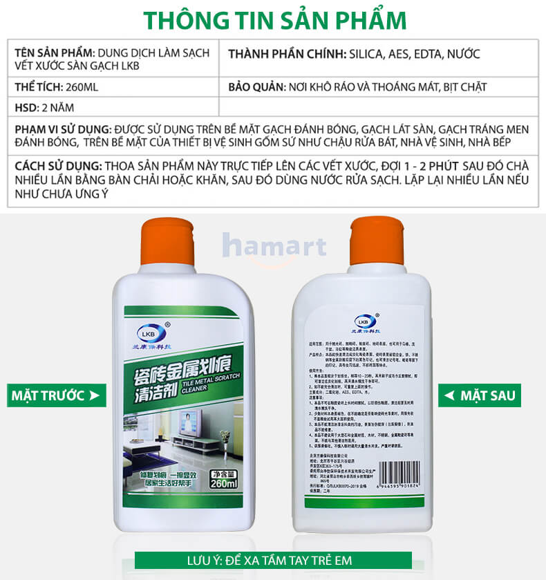 Mua tại TiktokDung Dịch Làm Sạch Vết Xước Sàn Gạch Men Lát Nền Nhà LKB 260ml - TẨY CỰC MẠNH, AN TOÀN, KHÔNG HẠI GẠCH - ĐA DẠNG BỀ MẶT GẠCH MEN, BỒN CẦU, BỒN TẮM Sàn nhà nhiều vết xước ảnh hưởng nghiêm trọng đến mỹ quan? ĐỪNG VỘI thay thế gạch mới, hãy sử dụng ngay dung dịch làm sạch vết xước sàn LKB để thấy hiệu quả vượt trội ! ***LƯU Ý: Sản phẩm có tác dụng tẩy vết xước đen trên bề mặt - Không có tác dụng Lấp Đầy các vết nứt, vết xước sâu, lún lõm ... ĐẶC ĐIỂM NỔI BẬT:
