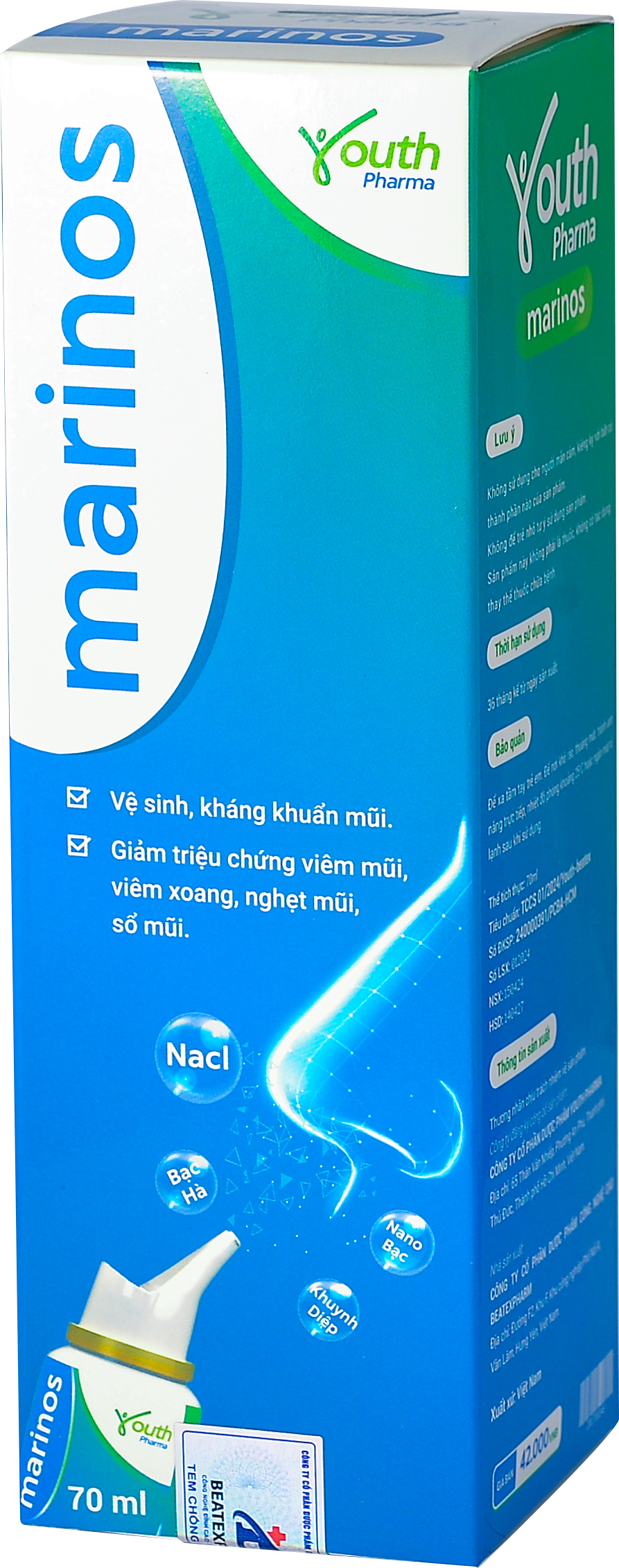 Xịt Mũi Marinos Youth Pharma 1. Công dụng: - Giúp mũi thông thoáng, dễ thở Hỗ trợ quá trình tái tạo niêm mạc mũi. - Ngăn ngừa vi khuẩn xâm nhập khoang mũi, giúp kháng